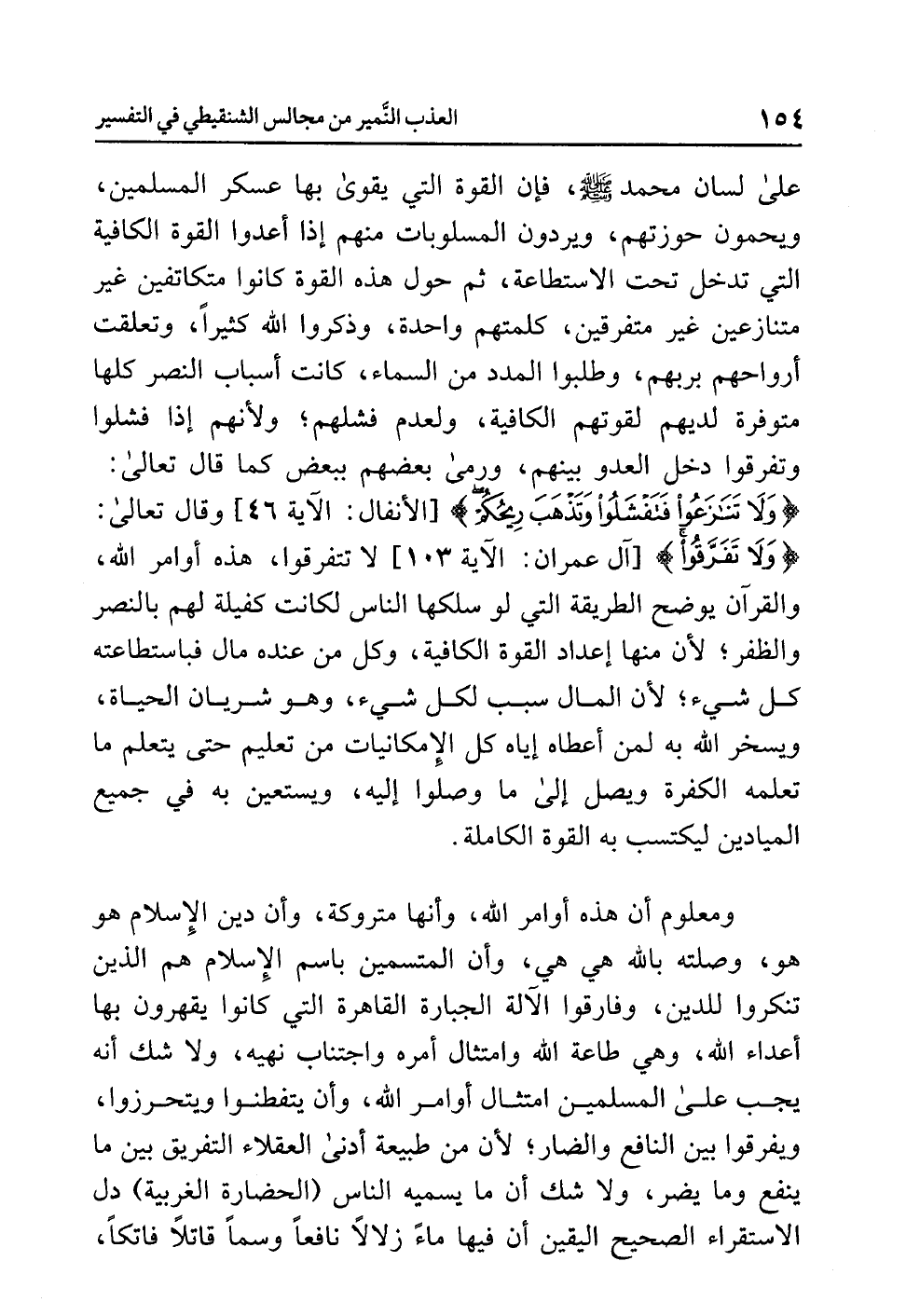 ومعلوم أن هذه أوامر الله، وأنها متروكة، وأن دين الإسلام هو هو، وصلته بالله هي هي، وأن المتسمين باسم الإسلام هم الذين تَنَكَّرُوا للدِّينِ، وفارقوا الآلة الجبارة القاهرة التي كانوا يقهرون بها أعداء الله، وهي طاعة الله وامتثال أمره واجتناب نهيه، ولا شك أنه يجب على المسلمين امتثال أوامر الله، وأن يَتَفَطَّنُوا ويَتَحَرَّزُوا، ويفرقوا بين النَّافِعِ والضَّارّ؛ لأن من طبيعة أدنى العقلاء التفريق بين ما ينفع وما يضر، ولا شك أن ما يسميه الناس (الحضارة الغربية) دل الاستقراء الصحيح اليقين أن فيها ماءً زلالاً نافعاً وسمّاً قاتلاً فاتكاً،