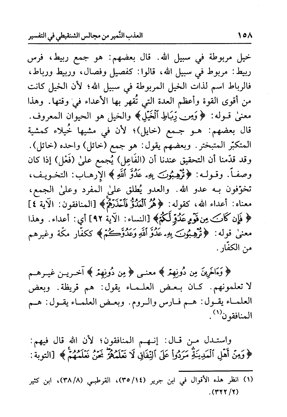خيل مربوطة في سبيل الله. قال بعضهم: هو جمع ربيط، فرس ربيط: مربوط في سبيل الله، قالوا: كفصيل وفصال، وربيط ورباط، فالرباط اسم لذات الخيل المربوطة في سبيل الله؛ لأن الخيل كانت من أقوى القوة وأعظم العدة التي تقهر بها الأعداء في وقتها. وهذا معنى قوله: {وَمِن رِّبَاطِ الْخَيْلِ} والخيل هو الحيوان المعروف. قال بعضهم: هو جمع (خايل)؛ لأن في مشيها خيلاء كمشية المتكبر المتبختر. وبعضهم يقول: هو جمع (خائل) واحده (خائل). وقد قدّمنا أن التحقيق عندنا أن (الفَاعِل) يُجمع على (فَعْل) إذا كان وصفاً. وقوله: {تُرْهِبُونَ بِهِ عَدُوَّ اللَّهِ} الإرهاب: التخويف، تخوّفون به عدو الله. والعدو يُطلق على المفرد وعلى الجمع، معناه: أعداء الله، كقوله: {هُمُ الْعَدُوُّ فَاحْذَرْهُمْ} [المنافقون: الآية 4] {فَإِن كَانَ مِن قَوْمٍ عَدُوٍّ لَّكُمْ} [النساء: الآية 92] أي: أعداء. وهذا معنى قوله: {تُرْهِبُونَ بِهِ عَدُوَّ اللَّهِ وَعَدُوَّكُمْ} ككفار مكّة وغيرهم من الكفّار.
