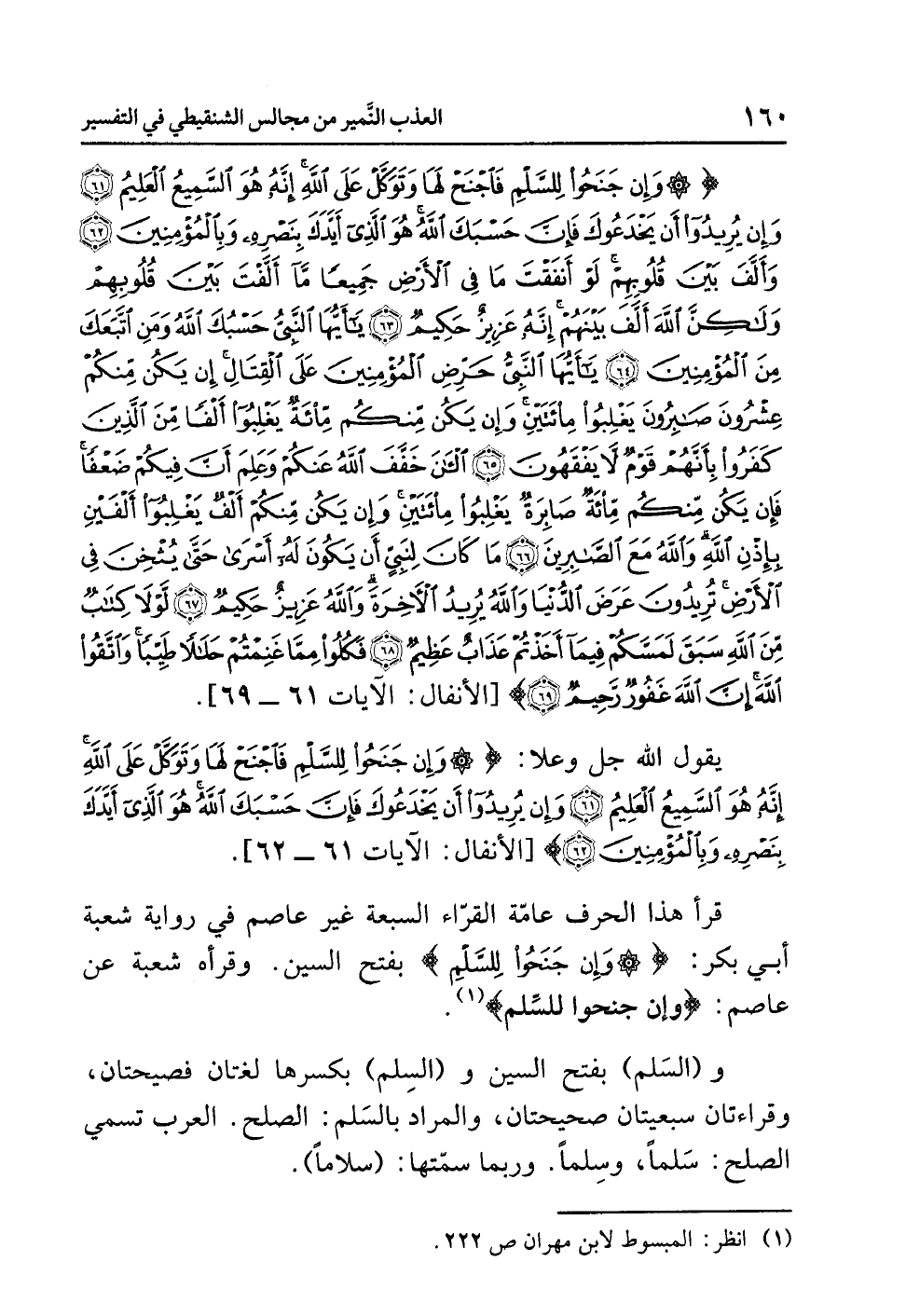 و (السَّلم) بفتح السين و (السِّلْم) بِكَسْرِهَا لُغَتَان فَصِيحَتَانِ، وقراءتان سَبْعِيَّتَانِ صحيحَتَانِ، والمراد بالسَّلم: الصُّلْح. العرب تسمي الصلح: سَلماً، وسِلماً. وربما سمّتها: (سلاماً).
