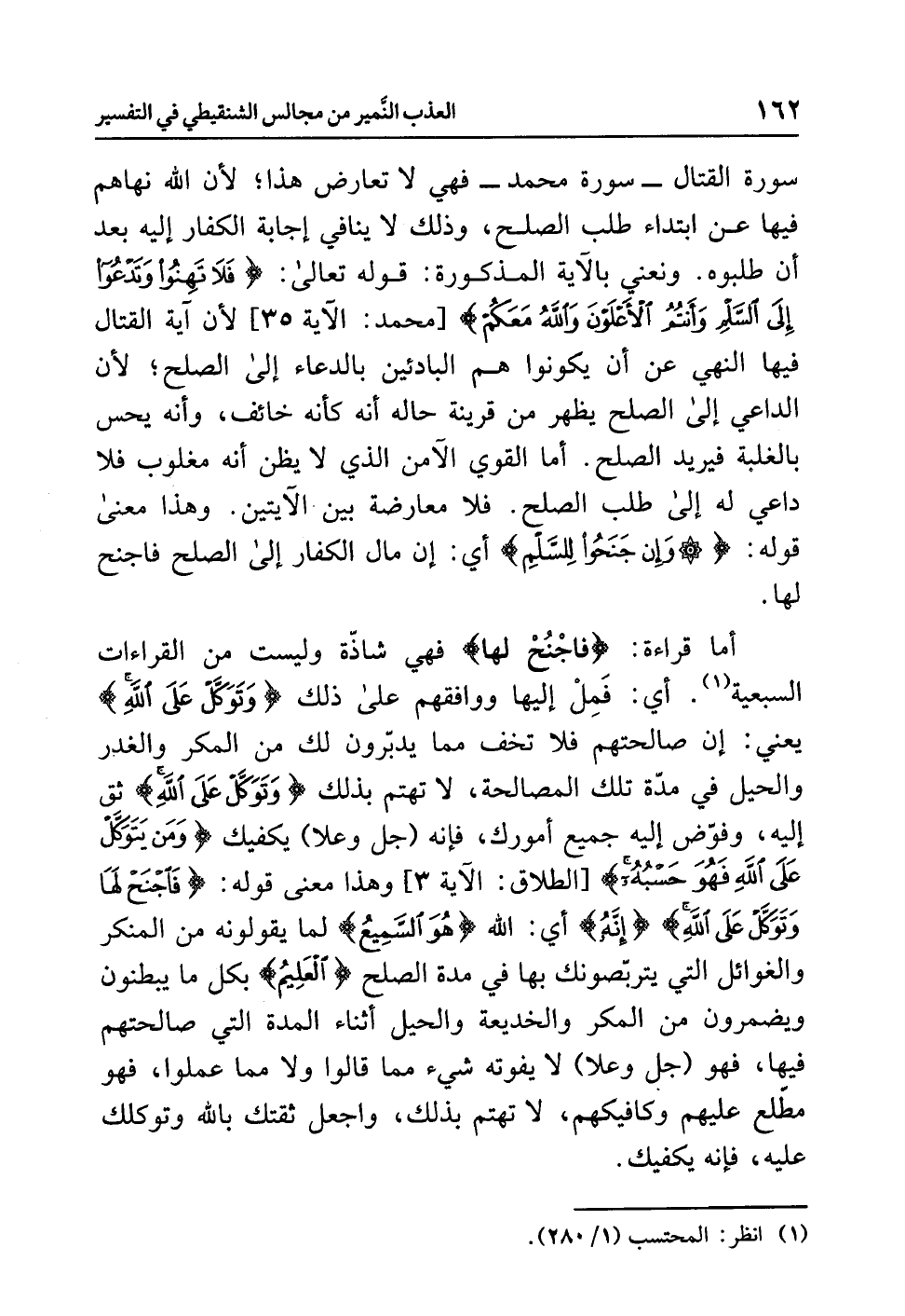 سورة القتال -سورة محمد- فهي لا تعارض هذا؛ لأن الله نهاهم فيها عن ابتداء طلب الصلح، وذلك لا ينافي إجابة الكفار إليه بعد أن طلبوه. ونعني بالآية المذكورة: قوله تعالى: {فَلا تَهِنُوا وَتَدْعُوا إِلَى السَّلْمِ وَأَنتُمُ الأَعْلَوْنَ وَاللَّهُ مَعَكُمْ} [محمد: الآية 35] لأن آية القتال فيها النهي عن أن يكونوا هم البادئين بالدعاء إلى الصلح؛ لأن الداعي إلى الصلح يظهر من قرينة حاله أنه كأنه خائف، وأنه يحس بالغلبة فيريد الصلح. أما القوي الآمن الذي لا يظن أنه مغلوب فلا داعي له إلى طلب الصلح. فلا معارضة بين الآيتين. وهذا معنى قوله: {وَإِن جَنَحُواْ لِلسَّلْمِ} أي: إن مال الكفار إلى الصلح فاجنح لها.