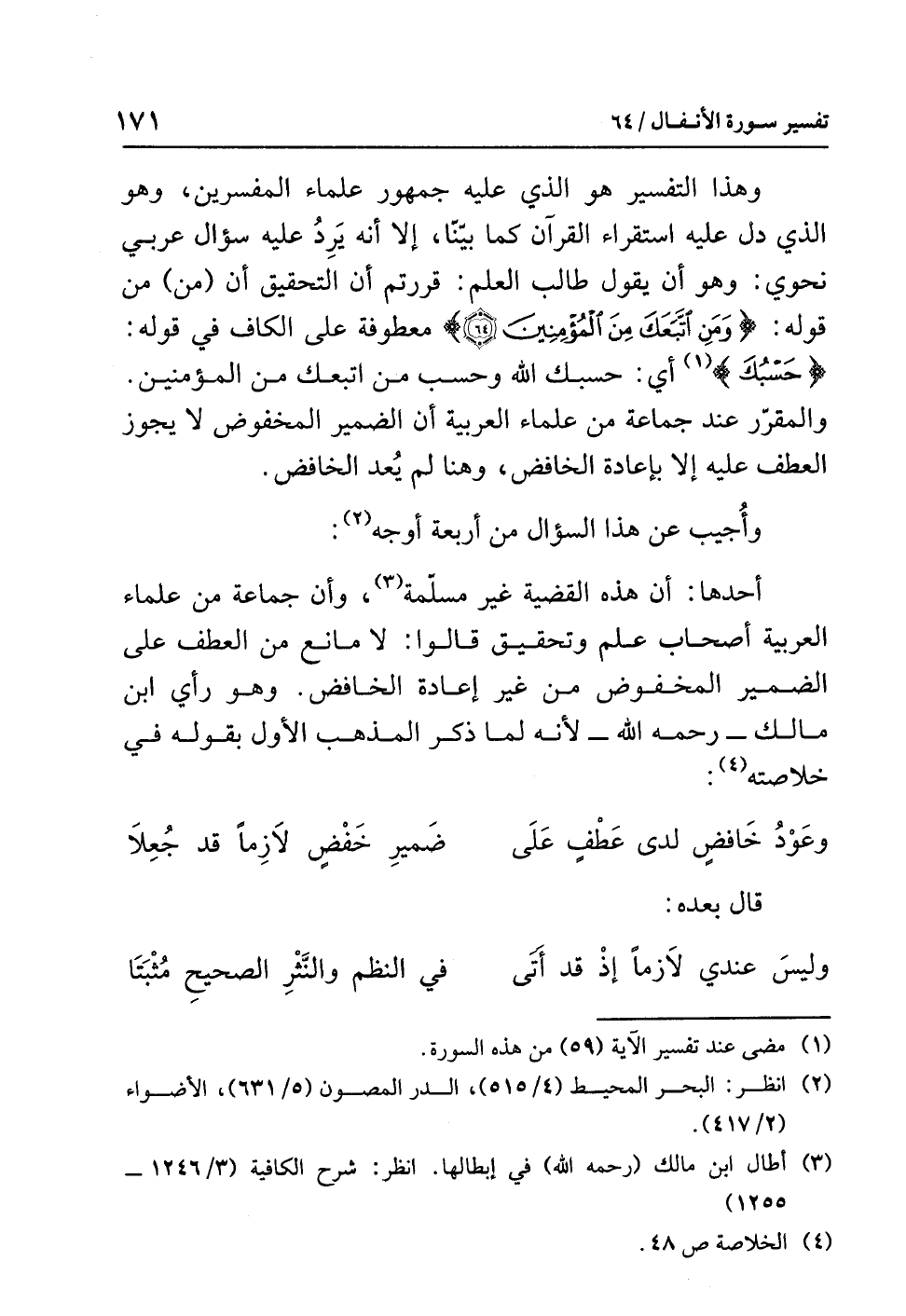 وهذا التفسير هو الذي عليه جُمْهُور عُلَماء المفَسِّرِين، وهو الذي دل عليه استقراء القرآن كما بيّنّا، إلا أنه يَرِدُ عليه سؤال عربي نحوي: وهو أن يقول طالب العلم: قررتم أن التحقيق أن (من) من قوله: {وَمَنِ اتَّبَعَكَ مِنَ الْمُؤْمِنِينَ} معطوفة على الكاف في قوله: {حَسْبُكَ} (¬1) أي: حَسْبُكَ اللهُ وَحَسْبُ مَنِ اتَّبَعَكَ مِنَ المُؤْمِنِينَ. والمقرَّر عند جماعة من علماء العربية أن الضمير المخْفُوض لا يجوز العطف عليه إلا بإعادة الخَافِض، وهنا لم يُعد الخافض.