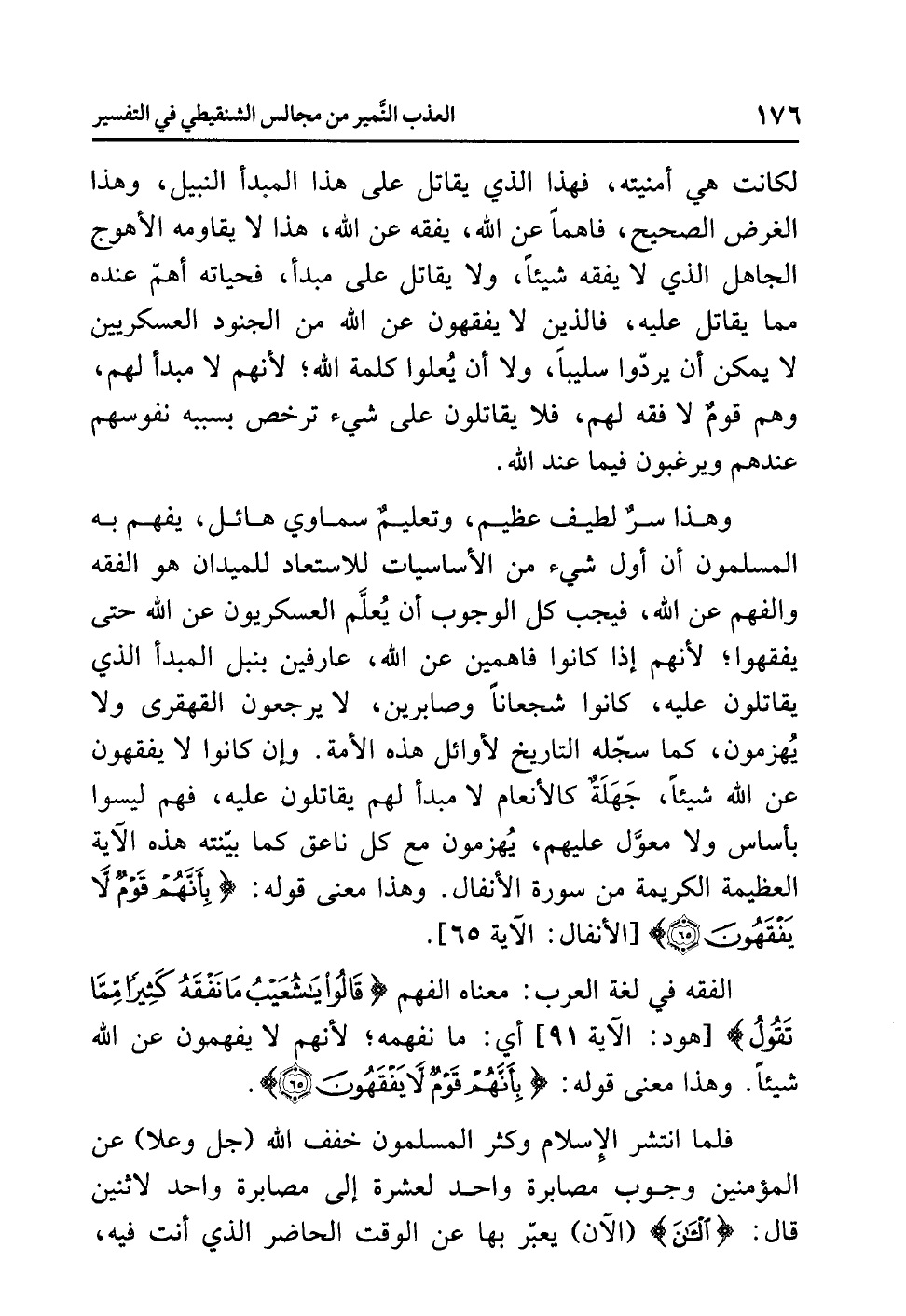وهذا سِرٌّ لطيف عظيم، وتعليمٌ سماوي هائل، يفهم به المُسْلِمُون أَنَّ أَوَّلَ شَيْءٍ من الأساسيات للاستعداد للميدان هو الفِقْه والفَهْم عن الله، فيَجِبُ كُلّ الوجُوب أن يُعلَّم العَسْكَرِيُّونَ عَنِ اللهِ حَتَّى يَفْقَهُوا؛ لأنهم إذا كانوا فَاهِمِين عَنِ الله، عارفين بِنُبْلِ المَبْدَأ الذي يقاتلون عليه، كانوا شجعاناً وصابرين، لا يَرْجِعُونَ القَهْقَرَى ولا يُهزمون، كما سَجَّلَهُ التاريخ لأوائل هذه الأمة. وإن كانوا لا يفقهون عن الله شيئاً، جَهَلةٌ كالأنعام لا مبدأ لهم يقاتلون عليه، فهم ليسوا بأساس ولا معوَّل عليهم، يُهزمون مع كل ناعق كما بيّنته هذه الآية العظيمة الكريمة من سورة الأنفال. وهذا معنى قوله: {بِأَنَّهُمْ قَوْمٌ لاَّ يَفْقَهُونَ} [الأنفال: الآية 65].