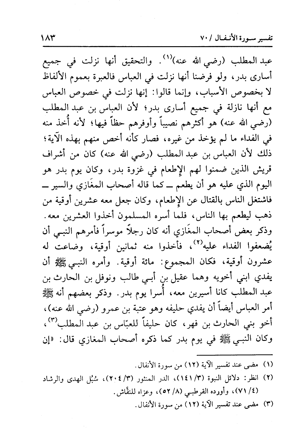 عبد المطلب (رضي الله عنه) (¬1). والتحقيق أنها نزلت في جميع أسارى بدر، ولو فرضنا أنها نزلت في العباس فالعبرة بعموم الألفاظ لا بخصوص الأسباب، وإنما قالوا: إنها نزلت في خصوص العباس مع أنها نازلة في جميع أسارى بدر؛ لأن العباس بن عبد المطلب (رضي الله عنه) هو أكثرهم نصيباً وأوفرهم حظّاً فيها؛ لأنه أُخذ منه في الفداء ما لم يؤخذ من غيره، فصار كأنه أخَصّ منهم بهذه الآية؛ ذلك لأن العباس بن عبد المطلب (رضي الله عنه) كان مِنْ أَشْرافِ قُرَيْشٍ الذين ضمنوا لهم الإطعام في غزوة بدر، وكان يوم بدر هو اليوم الذي عليه هو أن يطعم -كما قاله أصحاب المغازي والسير- فاشتغل الناس بالقتال عن الإطعام، وكان جعل معه عشرين أوقية مِنْ ذَهَبٍ ليطعم بها الناس، فلمَّا أَسَرَهُ المسْلِمُون أخذوا العشرين معه. وذكر بعض أصحاب المغَازي أنَّهُ كان رجلاً موسراً فأمرهم النبي أن يُضعِّفُوا الفداء عليه (¬2)، فأخذوا منه ثمانين أوقية، وضاعت له عشرون أوقية، فكان المجموع: مائة أوقية. وأمره النبي صلى الله عليه وسلم أَنْ يُفْدِي ابْنَيْ أخَوَيْهِ وهما عقيل بن أبي طالب ونَوْفَل بن الحارث بن عبد المطلب كانا أسيرين معه، أُسِرَا يَوْمَ بَدْر. وذكر بعضهم أنه صلى الله عليه وسلم أَمَرَ العَبَّاسَ أَيْضاً أن يُفْدِي حَلِيفَهُ وهو عُتْبَة بن عمرو (رضي الله عنه)، أخو بني الحارث بن فهر، كان حليفاً للعبَّاس بن عبد المطلب (¬3)، وكان النبي صلى الله عليه وسلم في يوم بدر كما ذكره أصحاب المغازي قال: «إِنَّ