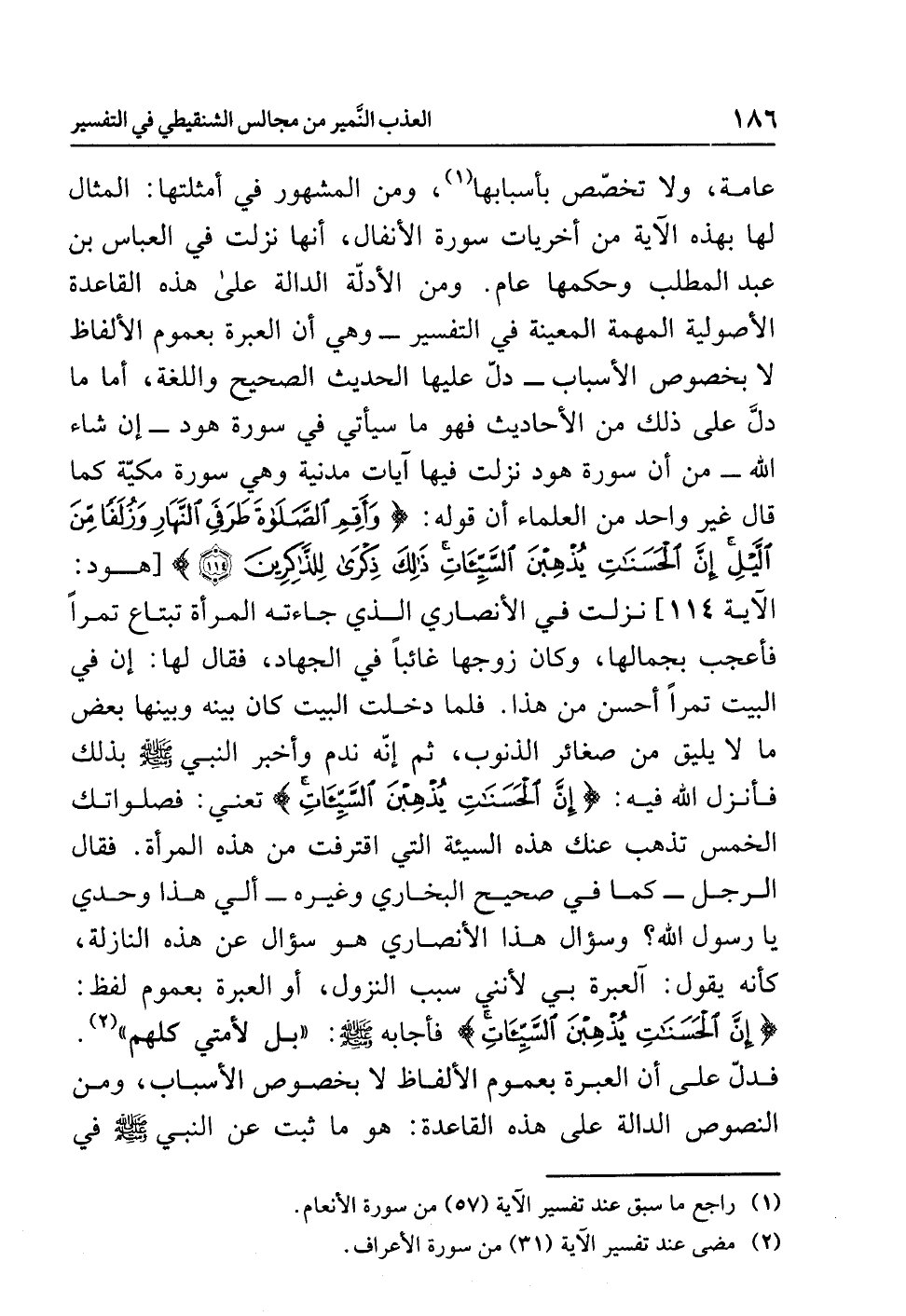 ومن الأدلّة الدالة على هذه القاعدة الأصولية المهِمَّة المُعِينَة في التفسير -وهي أن العبرة بعموم الألفاظ لا بخصوص الأسباب- دلّ عليها الحديث الصحيح واللغة، أما ما دلّ على ذلك من الأحاديث فهو ما سيأتي في سورة هود -إن شاء الله- من أن سورة هود نزلت فيها آيات مَدَنِيَّة وهي سورة مكية كما قال غير واحد من العلماء أن قوله: {وَأَقِمِ الصَّلاَةَ طَرَفَيِ النَّهَارِ وَزُلَفاً مِّنَ اللَّيْلِ إِنَّ الْحَسَنَاتِ يُذْهِبْنَ السَّيِّئَاتِ ذَلِكَ ذِكْرَى لِلذَّاكِرِينَ (114)} [هود: الآية 114] نزلت في الأنصاري الذي جاءته المرأة تبتاع تمراً فأعجب بجمالها، وكان زوجها غائباً في الجهاد، فقال لها: إن في البيت تمراً أحسن من هذا. فلما دخلت البيت كان بينه وبينها بعض ما لا يليق من صغائر الذنوب، ثم إنّه ندم وأخبر النبي صلى الله عليه وسلم بذلك، فأنزل الله فيه: {إِنَّ الْحَسَنَاتِ يُذْهِبْنَ السَّيِّئَاتِ} تعني: فصلواتك الخمس تذهب عنك هذه السيئة التي اقترفت من هذه المرأة. فقال الرجل -كما في صحيح البخاري وغيره- ألي هذا وحدي يا رَسُول الله؟ وسؤال هذا الأنصاري هو سؤال عن هذه النازلة، كأنه يقول: آلعبرة بي لأنني سبب النزول، أو العبرة بعموم لفظ: {إِنَّ الْحَسَنَاتِ يُذْهِبْنَ السَّيِّئَاتِ} فأجابه صلى الله عليه وسلم: «بَلْ لأُمَّتِي كُلِّهِمْ» (¬2). فَدَلّ على أن العبرة بعموم الألفاظ لا بخصوص الأسباب، ومن النصوص الدالة على هذه القاعدة: هو ما ثبت عن النبي صلى الله عليه وسلم في