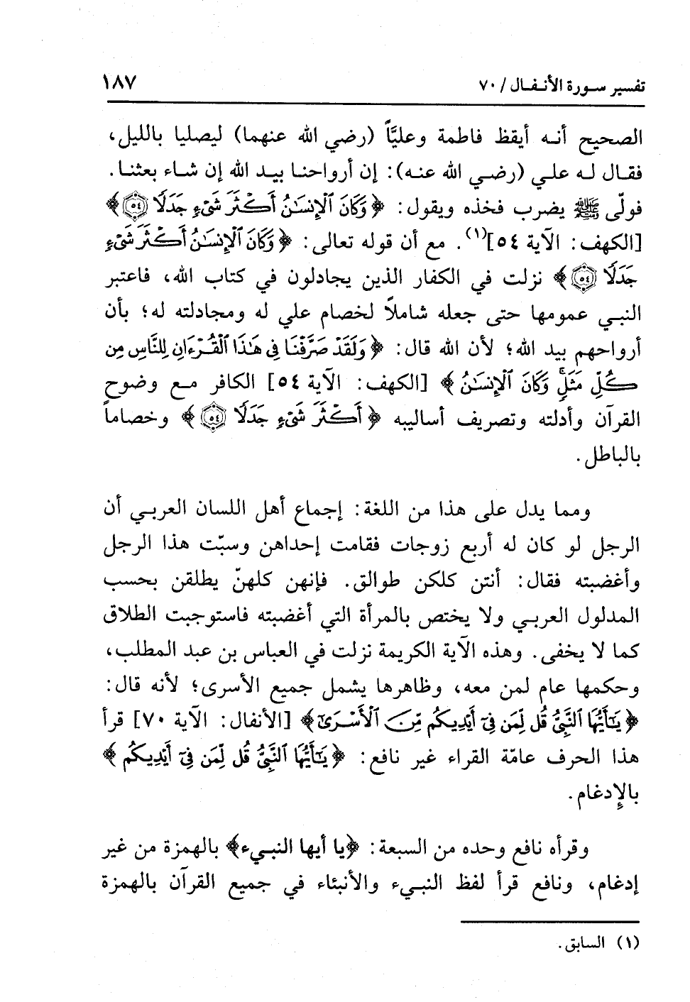 مع أن قوله تعالى: {وَكَانَ الإِنسَانُ أَكْثَرَ شَيْءٍ جَدَلاً} نزلت في الكفار الذين يجادلون في كتاب الله، فاعتبر النبي عمومها حتى جعله شاملاً لخصام علي له ومجادلته له؛ بأن أرواحهم بيد الله؛ لأن الله قال: {وَلَقَدْ صَرَّفْنَا فِي هَذَا الْقُرْآنِ لِلنَّاسِ مِن كُلِّ مَثَلٍ وَكَانَ الإِنسَانُ} الكافر مع وضوح القرآن وأدلته وتصريف أساليبه {أَكْثَرَ شَيْءٍ جَدَلاً} [الكهف: الآية 54] وخصاماً بالباطل.