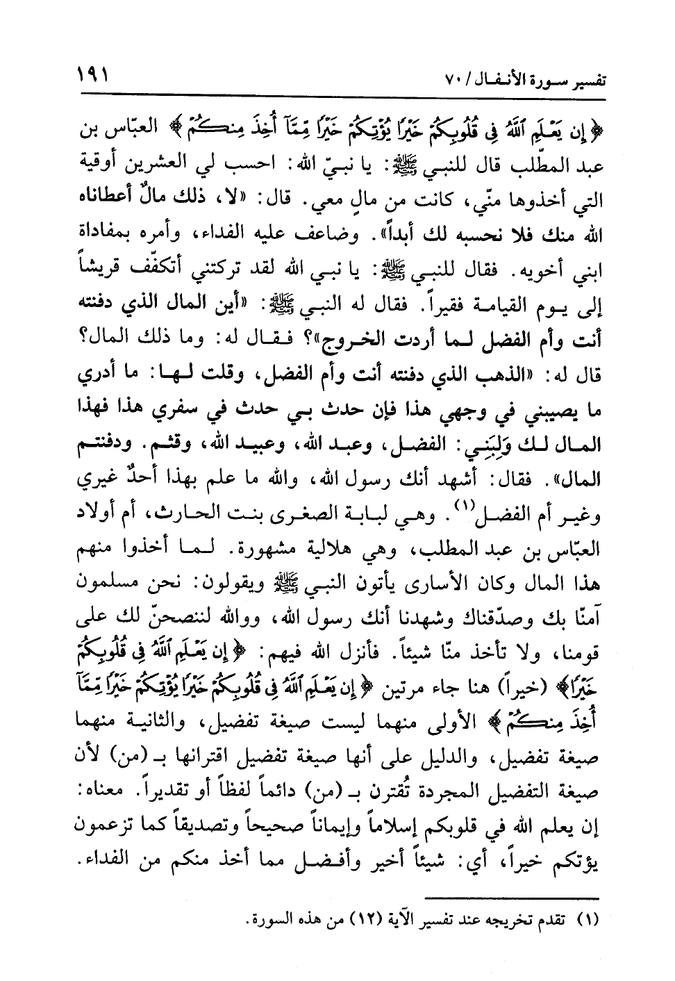 {إِن يَعْلَمِ اللهُ فِي قُلُوبِكُمْ خَيْراً يُؤْتِكُمْ خَيْراً مِّمَّا أُخِذَ مِنكُمْ} العبّاس بن عبد المطلب قال للنبي صلى الله عليه وسلم: يا نبيّ الله: احسب لي العشرين أوقية التي أخذوها منّي، كانت من مالٍ معي. قال: «لاَ، ذَلِكَ مَالٌ أَعْطَانَاهُ اللهُ مِنْكَ فَلاَ نَحْسِبُهُ لَكَ أَبَداً» وضاعف عليه الفداء، وأمَرَهُ بِمُفَادَاةِ ابْنَيْ أَخَوَيْهِ. فقال للنبي صلى الله عليه وسلم: يا نبي الله، لقد تركتني أَتَكَفَّفُ قُرَيْشاً إلى يوم القيامة فَقِيراً. فقال له النبي صلى الله عليه وسلم: «أَيْنَ المَالُ الَّذِي دَفَنْتَهُ أنْتَ وأم الفَضْلِ لما أرَدْت الخُرُوجَ»؟ فقال له: وما ذلك المال؟ قال له: «الذَّهَب الذي دفنْتَهُ أنت وأمّ الفَضْلِ، وقلت لها: ما أدْرِي ما يُصِيبُنِي فِي وَجْهِي هَذَا، فَإِنْ حَدَثَ بي حَدَتٌ في سَفَرِي هذا فهذا المال لَكِ وَلِبَنِي: الفَضْل، وعبد الله، وعبيد الله، وقثم. ودفنتم المَالَ». فقال: أشهد أنك رَسُول الله، والله ما علم بهذا أحدٌ غيري وغير أمّ الفَضْل (¬1). وهي لُبَابة الصغرى بنت الحارث، أم أولاد العبّاس بن عبد المطلب، وهي هلالية مشهورة. لما أخذوا منهم هذا المال وكان الأسارى يأتون النبي صلى الله عليه وسلم ويقولون: نحن مسلمون آمنّا بك وصدّقناك وشهدنا أنك رَسُول الله، ووالله لننصحنّ لك على قومنا، ولا تأخذ منّا شيئاً. فأنزل الله فيهم: {إِن يَعْلَمِ اللَّّهُ فِي قُلُوبِكُمْ خَيْراً} (خيراً) هنا جاء مرتين {إِن يَعْلَمِ اللَّهُ فِي قُلُوبِكُمْ خَيْراً يُؤْتِكُمْ خَيْراً مِّمَّا أُخِذَ مِنكُمْ} الأولى منهما ليست صيغة تفضيل، والثانية منهما صيغة تفضيل، والدليل على أنها صيغة تفضيل اقترانها بـ (من) لأَنّ صِيغَةَ التَّفْضِيل المجردة تُقترن بـ (من) دائماً لفظاً أو تقديراً.