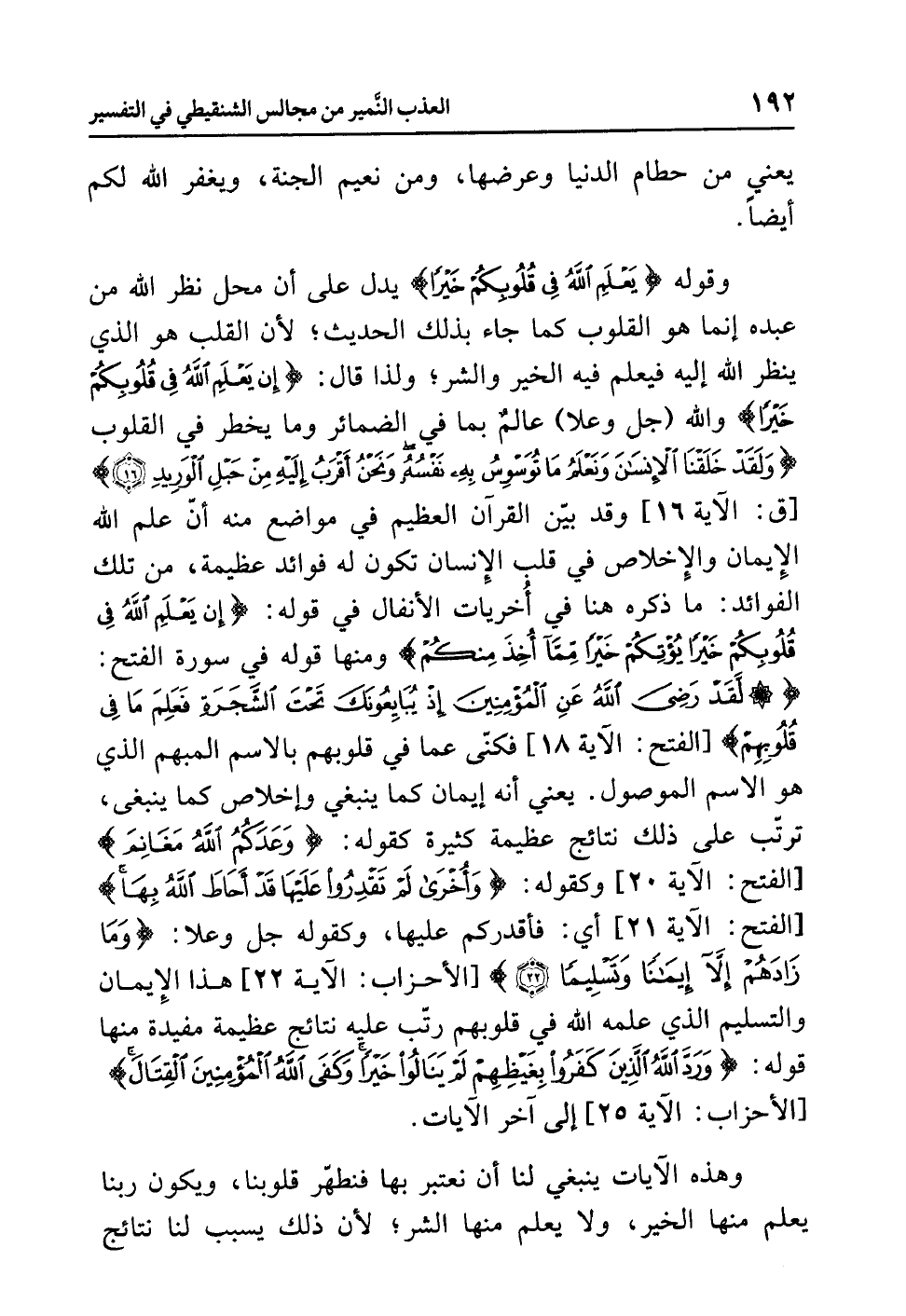 وقوله {يَعْلَمِ اللَّهُ فِي قُلُوبِكُمْ خَيْراً} يدل على أن محل نَظَرِ اللهِ من عبده إنما هو القلوب كما جاء بذلك الحديث؛ لأن القلب هو الذي ينظر الله إليه فيعلم فيه الخير والشر؛ ولذا قال: {إِن يَعْلَمِ اللهُ فِي قُلُوبِكُمْ خَيْراً} والله (جل وعلا) عالمٌ بما في الضمائر وما يخطر في القلوب {وَلَقَدْ خَلَقْنَا الإِنسَانَ وَنَعْلَمُ مَا تُوَسْوِسُ بِهِ نَفْسُهُ وَنَحْنُ أَقْرَبُ إِلَيْهِ مِنْ حَبْلِ الْوَرِيدِ (16)} [ق: الآية 16] وقد بيّن القرآن العظيم في مواضع منه أنّ علم الله الإيمان والإخلاص في قلب الإنسان تكون له فوائد عظيمة، من تلك الفوائد: ما ذكره هنا في أخريات الأنفال في قوله: {إِن يَعْلَمِ اللَّهُ فِي قُلُوبِكُمْ خَيْراً يُؤْتِكُمْ خَيْراً مِّمَّا أُخِذَ مِنكُمْ} ومنها قوله في سورة الفتح: {لَقَدْ رَضِيَ اللَّهُ عَنِ الْمُؤْمِنِينَ إِذْ يُبَايِعُونَكَ تَحْتَ الشَّجَرَةِ فَعَلِمَ مَا فِي قُلُوبِهِمْ} [الفتح: الآية 18] فَكَنّى عما في قلوبهم بالاسم المبْهَمِ الَّذِي هُوَ الاسْمُ الموْصول. يعني أنه إيمان كما ينبغي وإخلاص كما ينبغي، ترتّب على ذلك نتائج عظيمة كثيرة كقوله: {وَعَدَكُمُ اللَّهُ مَغَانِمَ} [الفتح: الآية 20] وكقوله: {وَأُخْرَى لَمْ تَقْدِرُوا عَلَيْهَا قَدْ أَحَاطَ اللَّهُ بِهَا} [الفتح: الآية 21] أي: فأقدركم عليها، وكقوله جل وعلا: {وَمَا زَادَهُمْ إِلاَّ إِيمَاناً وَتَسْلِيماً} [الأحزاب: الآية 22] هذا الإيمان والتسليم الذي علمه الله في قلوبهم رتّب عليه نتائج عظيمة مفيدة منها قوله: {وَرَدَّ اللَّهُ الَّذِينَ كَفَرُوا بِغَيْظِهِمْ لَمْ يَنَالُوا خَيْراً وَكَفَى اللَّهُ الْمُؤْمِنِينَ الْقِتَالَ} [الأحزاب: الآية 25] إلى آخر الآيات.