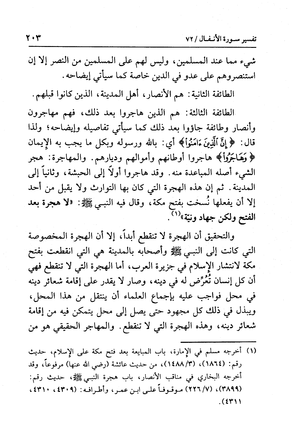 والتحقيق أن الهِجْرَةَ لا تنقطع أبَداً، إلا أن الهجرة المخصوصة التي كانت إلى النَّبِي صلى الله عليه وسلم وأصحابه بالمدينة هي التي انقطعت بفتح مكة لانتشار الإسلام في جزيرة العرب، أما الهجرة التي لا تَنْقَطِعُ فَهِيَ أنَّ كُلَّ إنسان تُعُرِّض له في دينه، وصار لا يقدر على إقامة شعائِرِ دِينِهِ في مَحل فواجب عليه بإجماع العلماء أن ينتقل من هذا المحل، ويبذل في ذلك كل مجهود حتى يَصِلّ إِلَى محل يتمكن فيه مِنْ إِقَامَةِ شَعَائِر دينه، وهذه الهجرة التي لا تَنْقَطِعُ. والمهاجر الحقيقي هو مَنْ