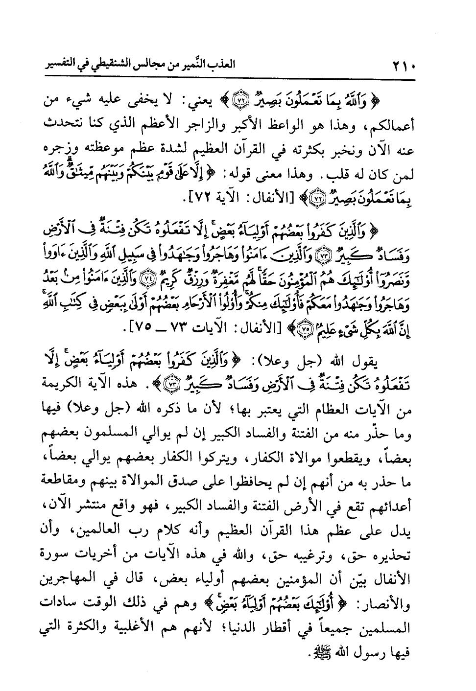 يقول الله (جل وعلا): {وَالَّذينَ كَفَرُواْ بَعْضُهُمْ أَوْلِيَاء بَعْضٍ إِلاَّ تَفْعَلُوهُ تَكُن فِتْنَةٌ فِي الأَرْضِ وَفَسَادٌ كَبِيرٌ (73)}. هذه الآية الكريمة من الآيات العظام التي يعتبر بها؛ لأن ما ذكره الله (جل وعلا) فيها وما حذر منه من الفتنة والفساد الكبير إن لم يوال المسلمون بعضهم بعضاً، ويقطعوا موالاة الكفار، ويتركوا الكفار بعضهم يوالي بعضاً، ما حذر به من أنهم إن لم يحافظوا على صدق الموالاة بينهم ومقاطعة أعدائهم تقع في الأرض الفتنة والفساد الكبير، فهو واقع منتشر الآن، يدل على عظم هذا القرآن العظيم وأنه كلام رب العالمين، وأن تحذيره حق، وترغيبه حق، والله في هذه الآيات من أخريات سورة الأنفال بَيَّنَ أن المؤمنين بعضهم أولياء بعض، قال في المهاجرين والأنصار: {أُوْلَئِكَ بَعْضُهُمْ أَوْلِيَاء بَعْضٍ} وهم في ذلك الوقت سادات المسلمين جميعاً في أقطار الدنيا؛ لأنهم هم الأغلبية والكثرة التي فيها رَسُول الله صلى الله عليه وسلم.