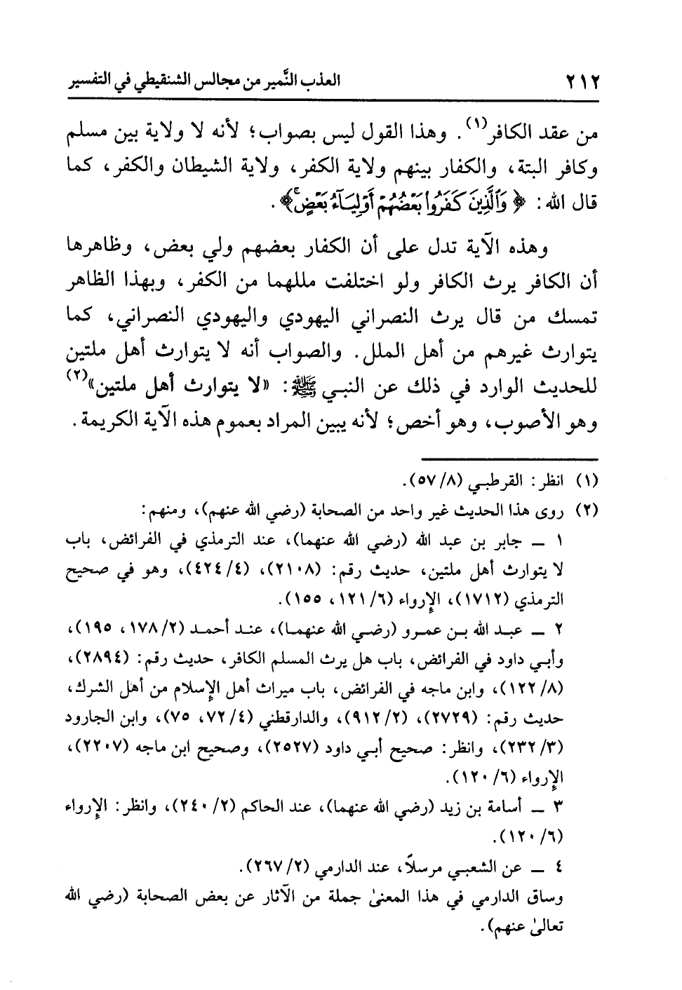 وهذه الآية تدل على أن الكفار بعضهم ولي بعض، وظاهرها أن الكافر يرث الكافر ولو اختلفت مللهما من الكفر، وبهذا الظاهر تمسك من قال يرث النصراني اليهودي واليهودي النصراني، كما يتوارث غيرهم من أهل الملل. والصواب أنه لا يتوارث أهل ملتين للحديث الوارد في ذلك عن النبي صلى الله عليه وسلم «لاَ يَتَوَارَثُ أَهْلُ مِلَّتَيْنِ» (¬2) وهو الأصْوَبُ، وهو أَخَصُّ؛ لأنه يبين المراد بعموم هذه الآية الكريمة.