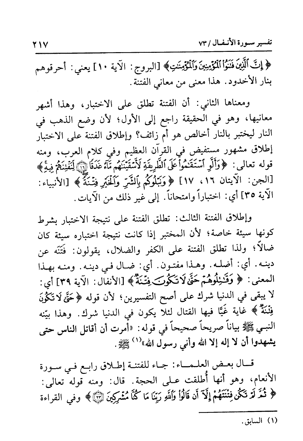وإطلاق الفتنة الثالث: تطلق الفتنة على نتيجة الاختبار بِشَرْطِ كَوْنِهَا سَيِّئَة خاصَّة؛ لأن المختبر إذا كانت نتيجة اختباره سيئة كان ضالاًّ؛ ولذا تُطْلَقُ الفِتْنَة على الكفر والضلال، يقولون: فَتَنَه عن دينه؛ أي: أضَلَّهُ. وهذا مفتون؛ أي: ضال في دينه. ومنه بهذا المعنى: {وَقَاتِلُوهُمْ حَتَّى لاَ تَكُونَ فِتْنَةٌ} [الأنفال: الآية 39] أي: لا يَبْقَى فِي الدنيا شرك على أصح التفسيرين؛ لأن قوله: {حَتَّى لاَ تَكُونَ فِتْنَةٌ} غاية غَيّا فيها القتال لِئَلاّ يكون في الدنيا شرك. وهذا بَيَّنَهُ النبي صلى الله عليه وسلم بياناً صريحاً صحيحاً في قوله: «أُمِرْتُ أَنْ أُقَاتِلَ النَّاسَ حَتَّى يَشْهَدُوا أَنْ لاَ إِلَهَ إِلاَّ اللهُ وَأَنِّي رَسُولُ اللهِ» (¬1).
