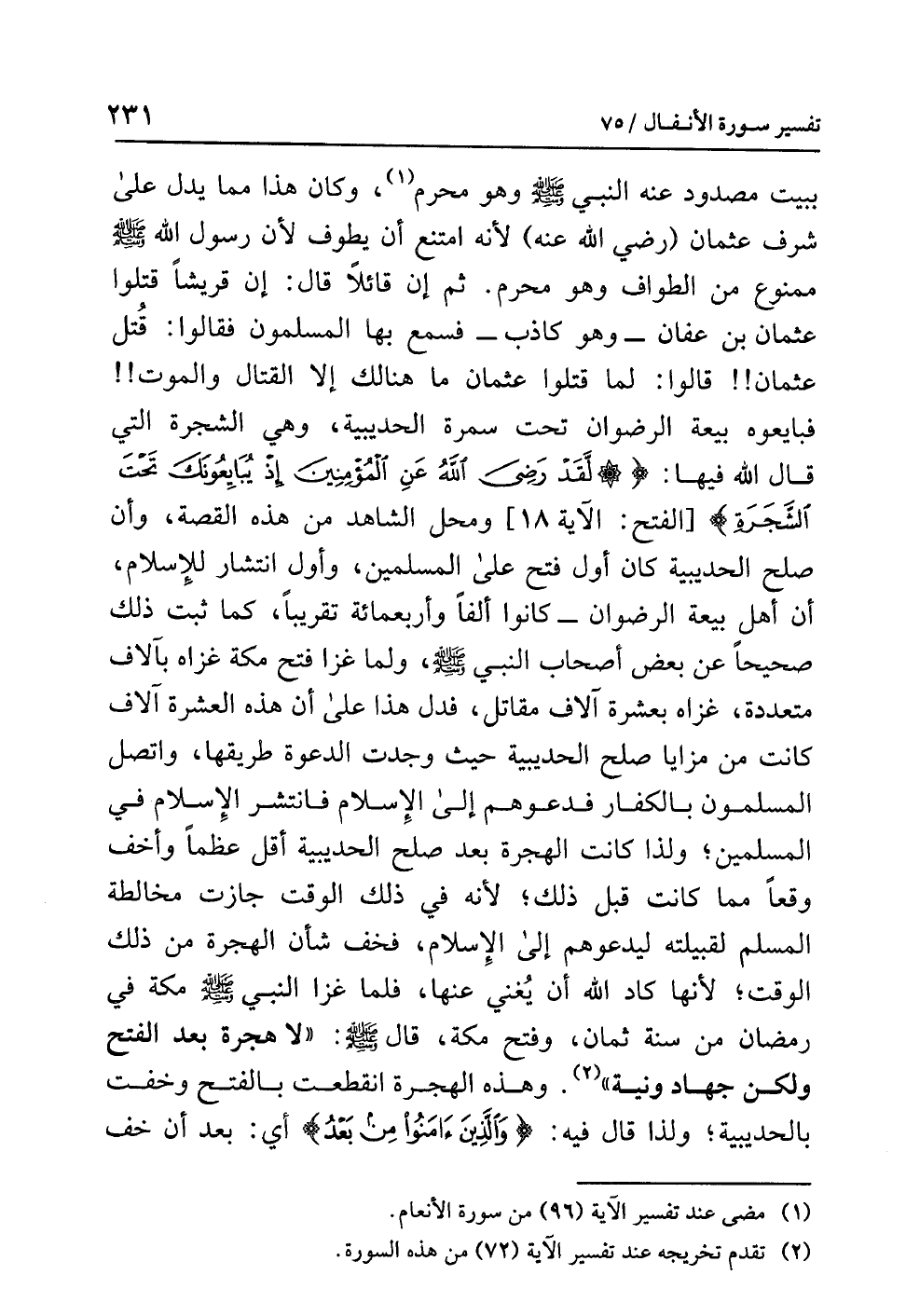 ببيت مصدود عنه النبي صلى الله عليه وسلم وهو محرم (¬1)، وكان هذا مما يدل على شرف عثمان (رضي الله عنه) لأنه امتنع أن يطوف؛ لأن رَسُول الله صلى الله عليه وسلم ممنوع من الطواف وهو محرم. ثم إن قائلاً قال: إن قريشاً قتلوا عثمان بن عفان -وهو كاذب- فسمع بها المسلمون فقالوا: قُتِلَ عثمان!! قالوا: لما قتلوا عثمان ما هنالك إلا القتال والموت!! فبايعوه بيعة الرضوان تحت سمرة الحديبية، وهي الشجرة التي قال الله فيها: {لَقَدْ رَضِيَ اللَّهُ عَنِ الْمُؤْمِنِينَ إِذْ يُبَايِعُونَكَ تَحْتَ الشَّجَرَةِ} [الفتح: الآية 18] ومحل الشاهد من هذه القصة، وأن صلح الحديبية كان أول فتح على المسلمين، وأول انتشار للإسلام، أن أهل بيعة الرضوان كانوا ألفًا وأربعمائة تقريباً، كما ثَبَتَ ذَلِكَ صَحِيحاً عن بعض أصحاب النبي صلى الله عليه وسلم، ولما غَزَا فتح مكة غزاه بآلاف متعددة، غزاه بعشرة آلاف مقاتل، فدل هذا على أن هذه العشرة الآلاف كانت من مزايا صلح الحديبية حيث وجدت الدعوة طريقها، واتصل المسلمون بالكفار فَدَعَوْهُمْ إلى الإسلام فانتشر الإسلام في المسلمين؛ ولذا كانت الهجرة بعد صلح الحديبية أقل عظماً وأخف وقعاً مما كانت قبل ذلك؛ لأنه في ذلك الوقت جازت مخالطة المسلم لقبيلته ليدعوهم إلى الإسلام، فخف شأن الهجرة من ذلك الوقت؛ لأنها كاد الله أن يُغني عنها، فلما غزا النبي صلى الله عليه وسلم مكة في رمضان من سنة ثمان، وفتح مكة، قال: «لاَ هِجْرَةَ بَعْدَ الْفَتْحِ وَلَكِنْ جِهَادٌ وَنِيَّةٌ» (¬2). وهذه الهجرة انقطعت بالفتح وخفت بالحديبية؛ ولذا قال فيه: {وَالَّذِينَ آمَنُواْ مِن بَعْدُ} أي: بعد أن خف