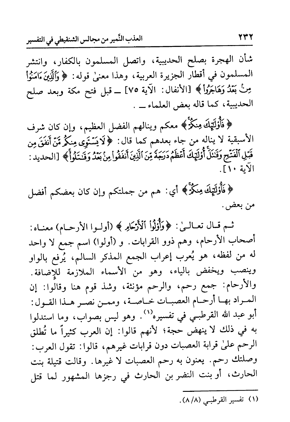 ثم قال تعالى: {وَأُوْلُواْ الأَرْحَامِ} (أولوا الأرحام) معناه: أصحاب الأرحام، وهم ذوو القرابات. و (أولوا) اسم جمع لا واحد له من لفظه، هو يُعرب إعراب الجمع المذكر السالم، يرفع بالواو وينصب ويخفض بالياء، وهو من الأسماء الملازمة للإضافة. والأرحام: جمع رحم، والرحم مؤنثة، وشذ قوم هنا وقالوا: إن المراد بها أرحام العصبات خاصة، وممن نصر هذا القول: أبو عبد الله القُرْطُبِي في تفسيره (¬1). وهو ليس بصواب، وما استدلوا به في ذلك لا ينهض حجة؛ لأنهم قالوا: إن العرب كثيراً ما تُطلق الرحم على قرابة العصبات دون قرابات غيرهم، قالوا: تقول العرب: وصلتك رحم. يعنون به رحم العصبات لا غيرها. وقالت قتيلة بنت الحارث، أو بنت النضر بن الحارث في رجزها المشهور لما قتل