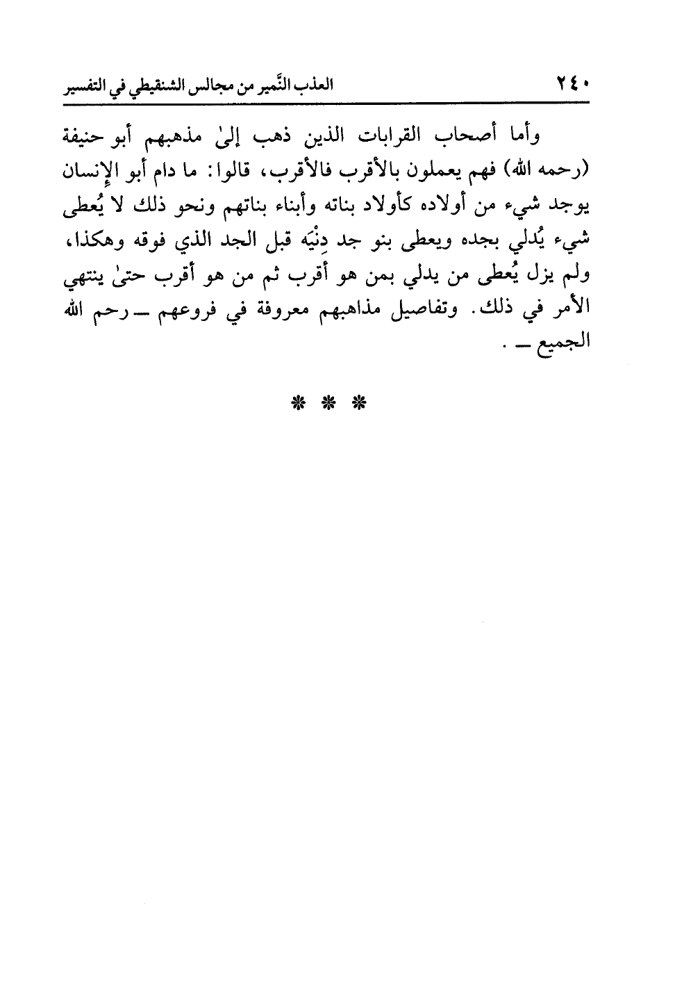 وأما أصحاب القرابات الذين ذهب إلى مذهبهم أبو حنيفة (رحمه الله) فهم يعملون بالأقرب فالأقرب، قالوا: ما دام أبو الإنسان يوجد شيء من أولاده كأولاد بناته وأبناء بناتهم ونحو ذلك لا يعطى شيء يدلي بجده ويعطى بنو جد دنيه قبل الجد الذي فوقه وهكذا، ولم يزل يُعطى من يدلي بمن هو أقرب ثم من هو أقرب حتى ينتهي الأمر في ذلك. وتفاصيل مذاهبهم معروفة في فروعهم، رحم الله الجميع.