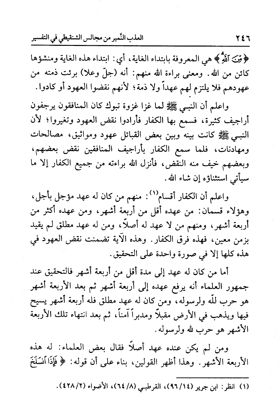 أما من كان له عهد إلى مدة أقَلّ مِنْ أرْبَعَةِ أشْهُرٍ فالتَّحْقِيقُ عند جمهور العلماء أنه يرفع عهده إلى أربعة أشهر ثم بعد الأربعة أشهر هو حرب لله ولرسوله، ومن كان له عهد مطلق فله أربعة أشهر يسيح فيها ويذهب في الأرض مقبلاً ومدبراً آمناً، ثم بعد انتهاء تلك الأربعة الأشهر هو حرب لله ولرسوله.