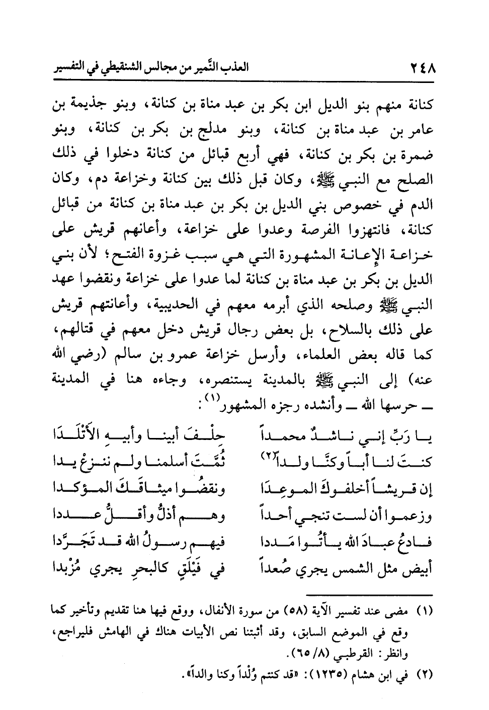 كنانة منهم بنو الديل ابن بكر بن عبد مناة بن كنانة، وبنو جذيمة بن عامر بن عبد مناة بن كنانة، وبنو مدلج بن بكر بن كنانة، وبنو ضمرة بن بكر بن كنانة، فهي أربع قبائل من كنانة دخلوا في ذلك الصلح مع النبي صلى الله عليه وسلم، وكان قبل ذلك بين كنانة وخزاعة دم، وكان الدم في خصوص بني الديل بن بكر بن عبد مناة بن كنانة من قبائل كنانة، فانتهزوا الفرصة وعدوا على خزاعة، وأعانهم قريش على خزاعة الإعانة المشهورة التي هي سبب غزوة الفتح؛ لأن بني الديل بن بكر بن عبد مناة بن كنانة لما عدوا على خزاعة ونقضوا عهد النبي صلى الله عليه وسلم وصلحه الذي أبرمه معهم في الحديبية، وأعانتهم قريش على ذلك بالسلاح، بل بعض رجال قريش دخل معهم في قتالهم، كما قاله بعض العلماء، وأرسل خزاعة عمرو بن سالم (رضي الله عنه) إلى النبي صلى الله عليه وسلم بالمدينة يستنصره، وجاءه هنا في المدينة - حرسها الله - وأنشده رجزه المشهور (¬1):