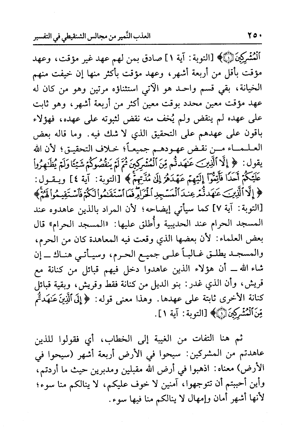 الْمُشْرِكِينَ} [التوبة: آية 1] صادق بمن لهم عهد غير مؤقت، وعهد مؤقت بأقل من أربعة أشهر، وعهد مؤقت بأكثر منها إن خيفت منهم الخيانة، بقي قسم واحد هو الآتي استثناؤه مرتين وهو من كان له عهد مؤقت معين محدد بوقت معين أكثر من أربعة أشهر، وهو ثابت على عهده لم ينقض ولم يخف منه نقض لثبوته على عهده، فهؤلاء باقون على عهدهم على التحقيق الذي لا شك فيه. وما قاله بعض العلماء من نقض عهودهم جميعاً؛ خلاف التحقيق؛ لأن الله يقول: {إِلاَّ الَّذِينَ عَاهَدتُّم مِّنَ الْمُشْرِكِينَ ثُمَّ لَمْ يَنقُصُوكُمْ شَيْئاً وَلَمْ يُظَاهِرُواْ عَلَيْكُمْ أَحَداً فَأَتِمُّواْ إِلَيْهِمْ عَهْدَهُمْ إِلَى مُدَّتِهِمْ} [التوبة: آية 4] ويقول: {إِلاَّ الَّذِينَ عَاهَدتُّمْ عِندَ الْمَسْجِدِ الْحَرَامِ فَمَا اسْتَقَامُواْ لَكُمْ فَاسْتَقِيمُواْ لَهُمْ} [التوبة: آية 7] كما سيأتي إيضاحه؛ لأن المراد بالذين عاهدوه عند المسجد الحرام عند الحديبية وأُطلق عليها: «المسجد الحرام» قال بعض العلماء: لأن بعضها الذي وقعت فيه المعاهدة كان من الحرم، والمسجد يطلق غالباً على جميع الحرم، وسيأتي هناك -إن شاء الله- أن هؤلاء الذين عاهدوا دخل فيهم قبائل من كنانة مع قريش، وأن الذي غدر: بنو الديل من كنانة فقط وقريش، وبقية قبائل كنانة الأخرى ثابتة على عهدها. وهذا معنى قوله: {إِلَى الَّذِينَ عَاهَدتُّم مِّنَ الْمُشْرِكِينَ} [التوبة: آية 1].