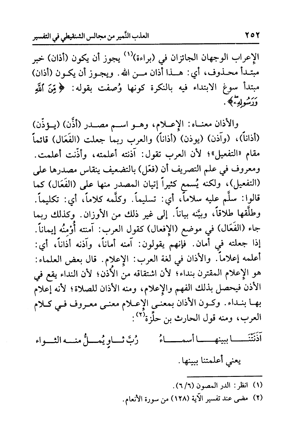 الإعراب الوجهان الجائزان في (براءة) (¬1) يجوز أن يكون (أذان) خبر مبتدأ محذوف، أي: هذا أذان من الله. ويجوز أن يكون (أذان) مبتدأ سوغ الابتداء فيه بالنكرة كونها وُصفت بقوله: {وَأَذَانٌ مِّنَ اللَّهِ وَرَسُولِهِ}.