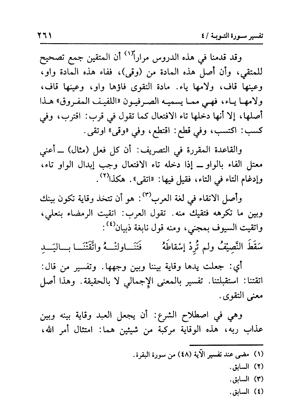 وأصل الاتِّقَاء في لغة العرب (¬3): هو أن تتخذ وقاية تكون بينك وبين ما تَكْرَهُهُ فَتَقِيكَ منه. تقول العرب: اتقيت الرمضاء بنعلي، واتقيت السيوف بمجني، ومنه قول نابغة ذبيان (¬4):
