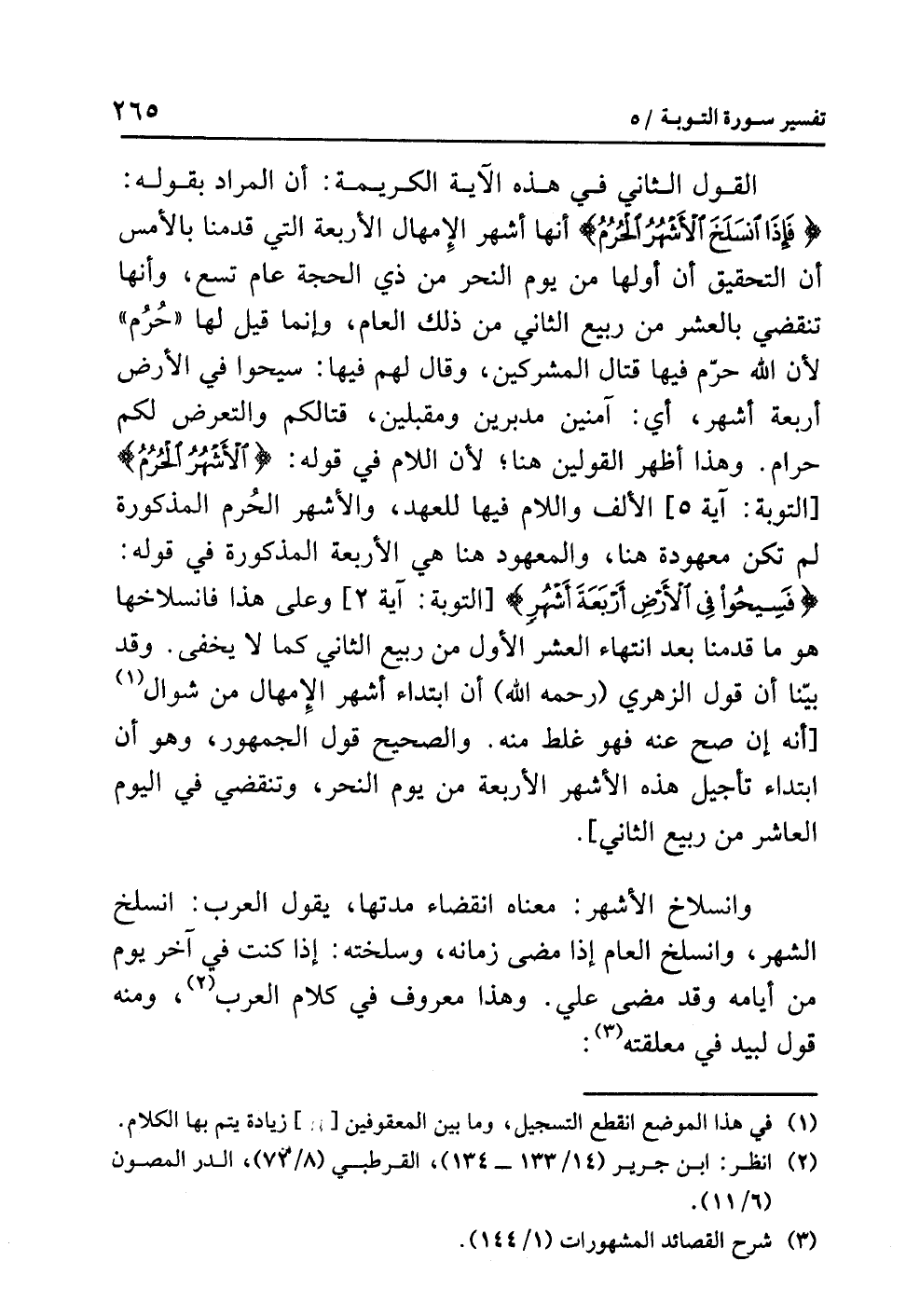 وانسلاخ الأشهر: معناه انْقِضَاء مُدَّتِهَا. تقول العَرَبُ: انْسَلَخَ الشَّهْرُ، وانْسَلَخَ العَامُ: إذا مَضَى زَمَانُهُ، وسلخته: إذا كنت في آخر يوم من أيامه وقد مضى علي. وهذا معروف في كلام العرب (¬2)، ومنه قول لبيد في مُعَلَّقَتِهِ (¬3):