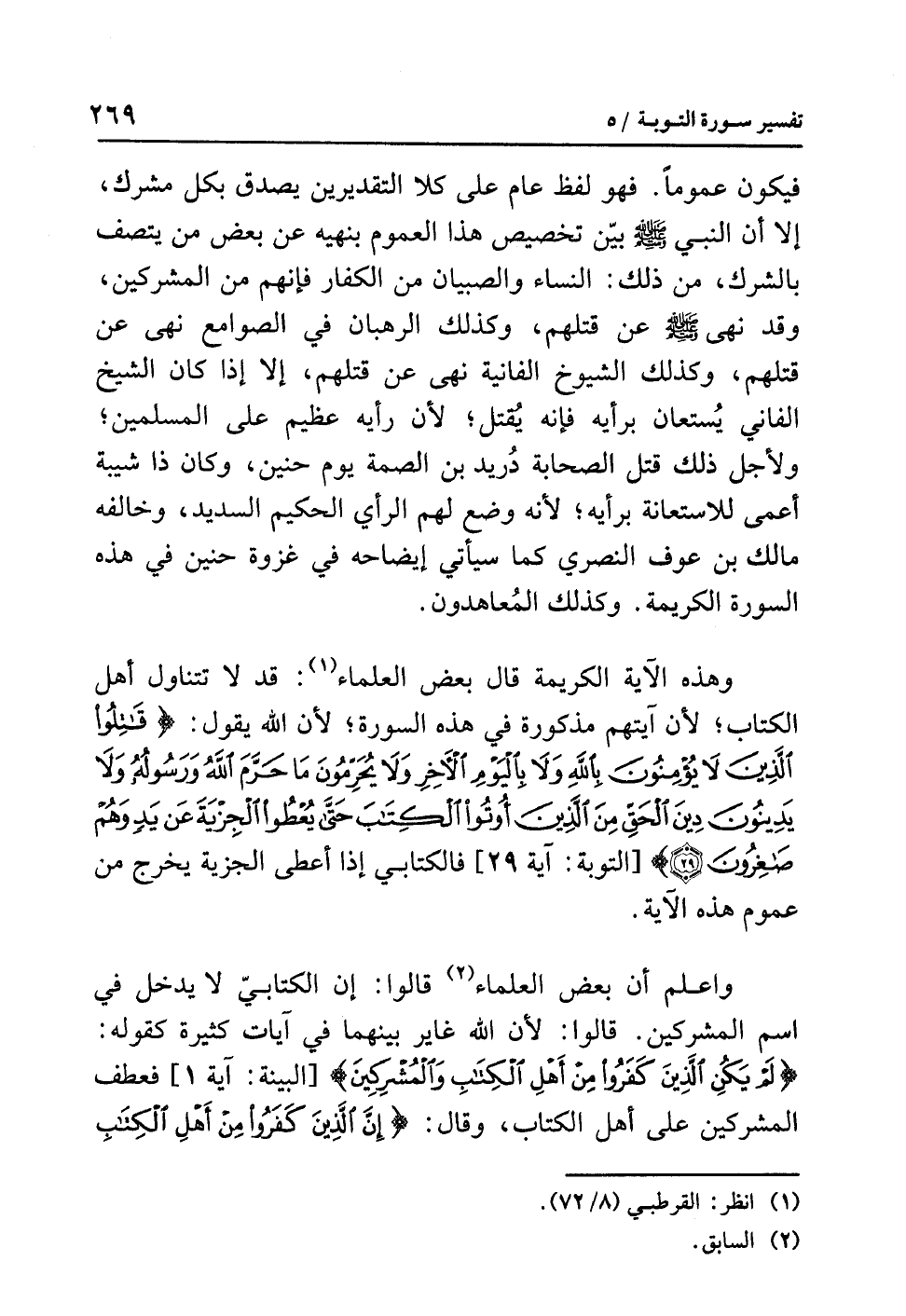 فيكون عموماً، فهو لفظ عام على كلا التَّقْدِيرَيْنِ يصدق بكل مشرك، إلا أن النبي صلى الله عليه وسلم بيّن تخصيص هذا اليوم بنهيه عن بعض مَنْ يَتَّصِفُ بالشرك، من ذلك: النساء والصبيان من الكفار فإنهم من المشركين، وقد نهى صلى الله عليه وسلم عن قتلهم، وكذلك الرهبان في الصوامع نهى عن قتلهم، وكذلك الشيوخ الفانية نهى عن قتلهم، إلا إذا كان الشيخ الفاني يُستعان برأيه فإنه يُقتل؛ لأن رأيه عظيم على المسلمين؛ ولأجل ذلك قتل الصحابة دُريد بن الصمة يوم حنين، وكان ذا شيبة أعمى للاستعانة برأيه؛ لأنه وضع لهم الرأي الحكيم السديد، وخالفه مالك بن عوف النصري كما سيأتي إيضاحه في غزوة حنين في هذه السورة الكريمة. وكذلك المُعاهدون.