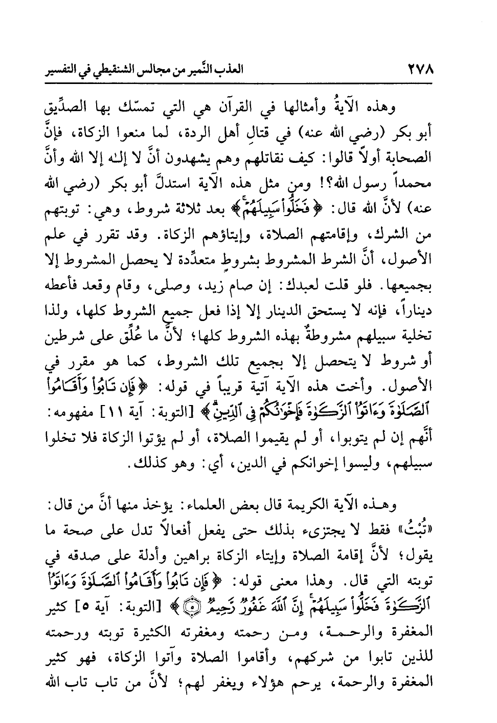 وهذه الآيةُ وأمثالها في القرآن هي التي تمسّك بها الصدِّيق أبو بكر (رضي الله عنه) في قتالِ أهل الردة، لما منعوا الزكاة، فإنَّ الصَّحَابَةَ أوَّلاً قالوا: كيف نُقَاتِلُهُمْ وَهُمْ يَشْهَدُون أن لا إله إلا الله وأنَّ محمَّداً رَسُول الله؟! ومن مثل هذه الآية استدلَّ أبو بكر (رضي الله عنه) لأن الله قال: {فَخَلُّواْ سَبِيلَهُمْ} بعد ثلاثة شروط، وهي: توبتهم مِنَ الشِّرْك، وإقامتهم الصلاة، وإيتاؤهم الزكاة. وقد تَقَرَّرَ في علم الأصول، أنَّ الشرط المشروط بشروطٍ متعدِّدة لا يحصل المشروط إلا بجميعها. فلو قلت لِعَبْدِكَ: إن صام زيد، وصلى، وقام وقعد فأَعْطِهِ دِيناراً، فإنه لا يستحق الدينار إلا إذا فعل جميع الشروط كلها، ولذا تخلية سبيلهم مشروطةٌ بهذه الشروط كلها؛ لأنَّ ما عُلِّق على شرطين أو شروط لا يتحصل إلا بجميع تلك الشروط، كما هو مقرر في الأصول. وأخت هذه الآية آتية قريباً في قوله: {فَإِن تَابُواْ وَأَقَامُواْ الصَّلاَةَ وَآتَوُاْ الزَّكَاةَ فَإِخْوَانُكُمْ فِي الدِّينِ} [التوبة: آية 11] مفهومه: أنَّهم إن لَمْ يَتُوبُوا، أَوْ لم يُقِيمُوا الصلاة، أو لم يؤتوا الزكاة فلا تخلوا سبيلهم، وليسوا إخوانكم في الدين، أي: وهو كذلك.