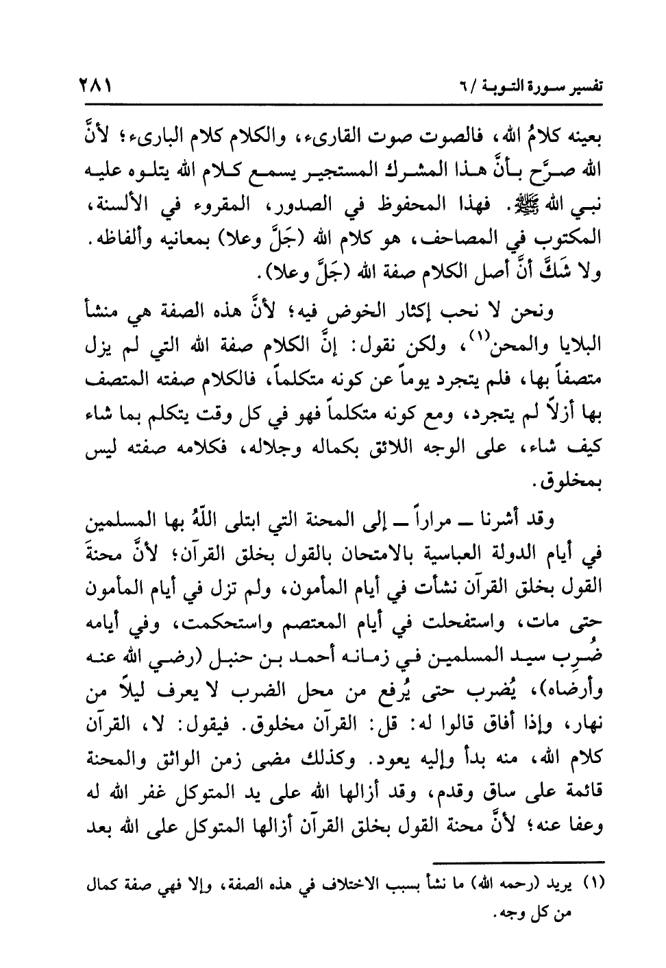 ونحن لا نحب إكثار الخوض فيه؛ لأن هذه الصفة هي منشأ البلايا والمحن (¬1)، ولكن نقول: إن الكلام صفة الله التي لم يزل متصفاً بها، فلم يتجرد يوماً عن كونه متكلماً، فالكلام صفته المتَّصِف بها أزلاً لم يَتَجَرَّدْ، ومَعَ كَوْنِهِ مُتَكَلِّماً فهو في كل وقت يَتَكَلَّمُ بِمَا شاء كيف شاء، على الوجه اللائق بِكَمَالِهِ وجَلالِهِ، فَكَلامُهُ صفته ليس بمخلوق.