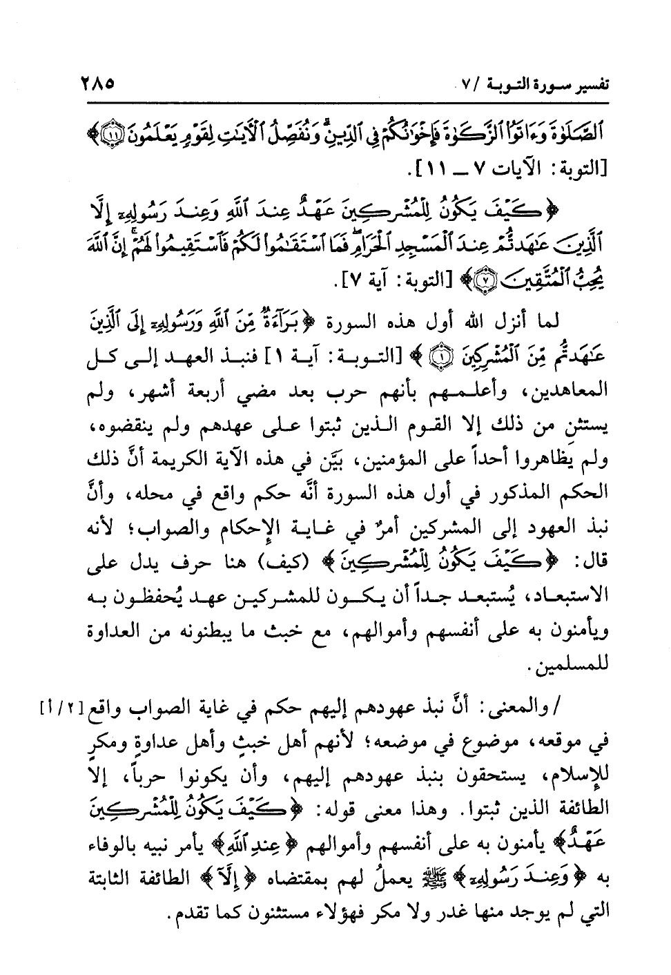 {كَيْفَ يَكُونُ لِلْمُشْرِكِينَ عَهْدٌ عِندَ اللَّهِ وَعِندَ رَسُولِهِ إِلاَّ الَّذِينَ عَاهَدتُّمْ عِندَ الْمَسْجِدِ الْحَرَامِ فَمَا اسْتَقَامُواْ لَكُمْ فَاسْتَقِيمُواْ لَهُمْ إِنَّ اللَّهَ يُحِبُّ الْمُتَّقِينَ (7)} [التوبة: آية 7].