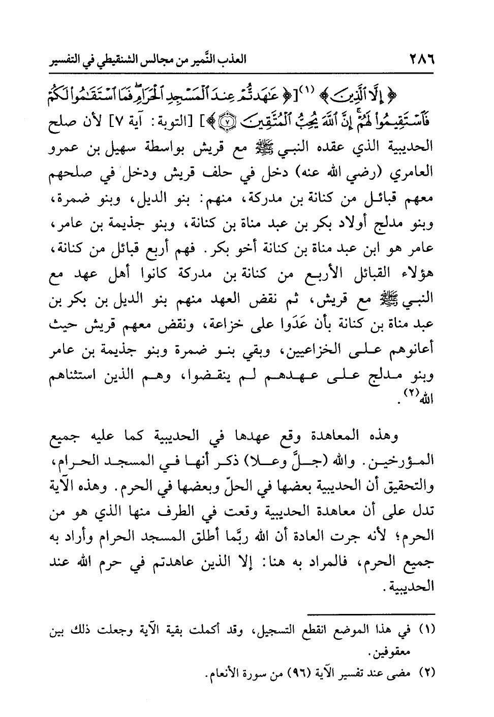 {إِلاَّ الَّذِينَ [عَاهَدتُّمْ عِندَ الْمَسْجِدِ الْحَرَامِ فَمَا اسْتَقَامُواْ لَكُمْ فَاسْتَقِيمُواْ لَهُمْ إِنَّ اللَّهَ يُحِبُّ الْمُتَّقِينَ}] (¬1) [التوبة: آية 7] لأن صلح الحديبية الذي عقده النبي صلى الله عليه وسلم مع قريش بواسطة سهيل بن عمرو العامري (رضي الله عنه) دخل في حلف قريش ودخل في صلحهم معهم قبائل من كنانة بن مدركة، منهم: بنو الديل، وبنو ضمرة، وبنو مدلج أولاد بكر بن عبد مناة بن كنانة، وبنو جذيمة بن عامر، عامر هو ابن عبد مناة بن كنانة أخو بكر. فهم أربع قبائل من كنانة، هؤلاء القبائل الأربع من كنانة بن مدركة كانوا أهل عهد مع النبي صلى الله عليه وسلم مع قريش، ثم نقض العهد منهم بنو الديل بن بكر بن عبد مناة بن كنانة بأن عَدَوا على خُزَاعَةَ، ونقض معهم قريش حيث أعانوهم على الخزاعيين، وبَقِيَ بَنُو ضَمْرَةَ وبَنُو جذيمة بن عامر وبنو مدْلِج على عهدهم لم ينقضوا، وهم الذين استثناهم الله (¬2).