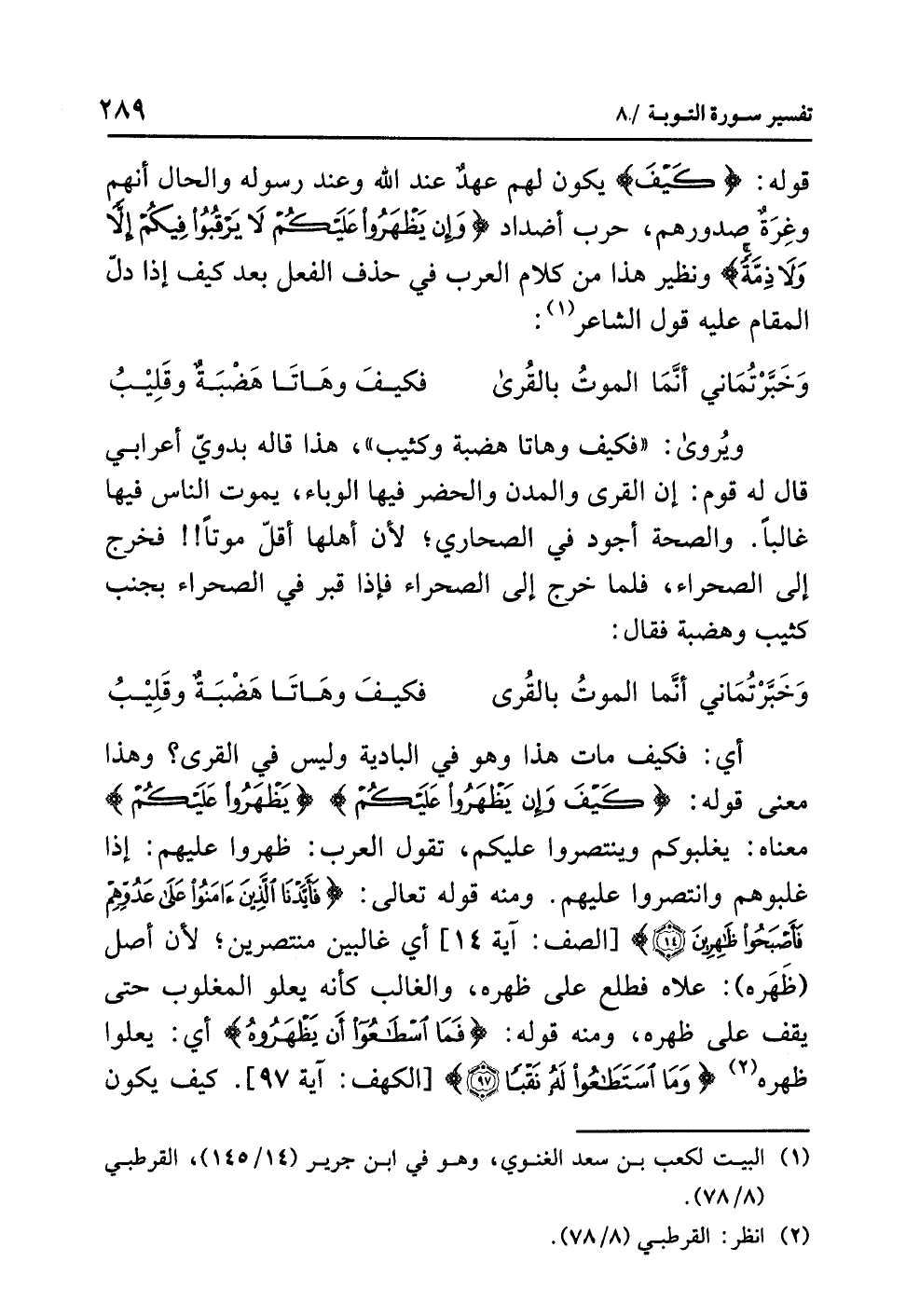 قوله: {كَيْفَ} يكون لهم عهدٌ عند الله وعند رسوله والحال أنهم وغِرَةٌ صدورهم، حرب أضداد {وَإِن يَظْهَرُوا عَلَيْكُمْ لاَ يَرْقُبُواْ فِيكُمْ إِلاًّ وَلاَ ذِمَّةً} ونظير هذا من كلام العرب في حذف الفعل بعد كيف إذا دَلَّ المَقَام عليه قول الشاعر (¬1):