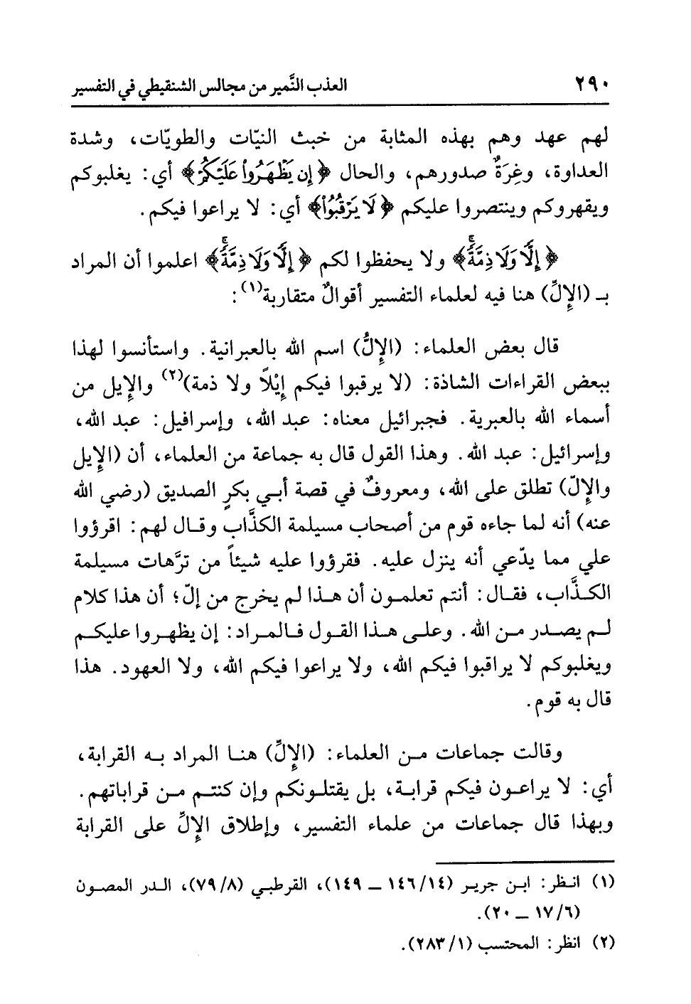 {إِلاًّ وَلاَ ذِمَّةً} ولا يحفظوا لكم {إِلاًّ وَلاَ ذِمَّةً} اعلموا أن المراد بـ (الإلّ) هنا فيه لعلماء التفسير أقوالٌ متقاربة (¬1):