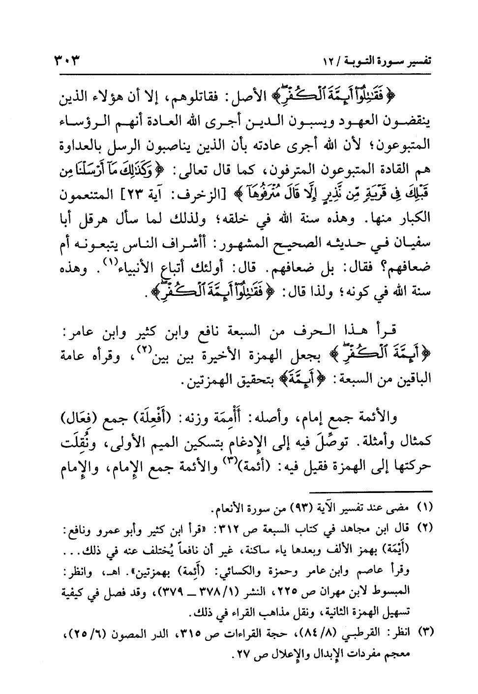 (¬2) قال ابن مجاهد في كتاب السبعة ص312: «قرأ ابن كثير وأبو عمرو ونافع: (أَيْمَة) بهمز الألف وبعدها ياء ساكنة. غير أن نافعاً يُختلف عنه في ذلك ... وقرأ عاصم وابن عامر وحمزة والكسائي: (أَئِمة) بهمزتين» اهـ. وانظر: المبسوط لابن مهران ص225، النشر (1/ 378 - 379) وقد فصل في كيفية تسهيل الهمزة الثانية ونقل مذاهب القُرَّاء في ذلك.