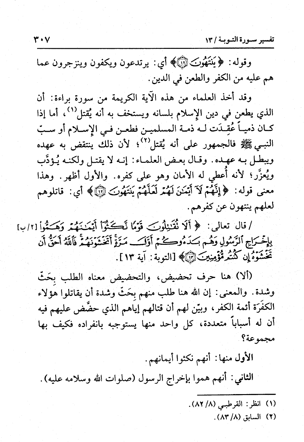 وقد أخذ العلماء من هذه الآية الكريمة من سورة براءة: أن الذي يطعن في دين الإسلام بلسانه ويستخف به أنه يُقتل (¬1)، أما إذا كان ذِمِّيّاً عُقِدَت له ذِمَّةُ المسلمين فطعن في الإسلام أو سبّ النبي صلى الله عليه وسلم فالجمهور على أنه يُقتل (¬2)؛ لأن ذلك ينتقض به عهده ويبطل به عهده. وقال بعض العلماء: إنه لا يقتل ولكنه يُؤدَّب ويُعَزَّر؛ لأنَّهُ أُعْطِيَ له الأمان وهو على كفره. والأول أظْهَر. وهذا معنى قوله: {إِنَّهُمْ لاَ أَيْمَانَ لَهُمْ لَعَلَّهُمْ يَنتَهُونَ} أي: قاتلوهم لَعَلَّهُمْ يَنتَهُون عن كفرهم.