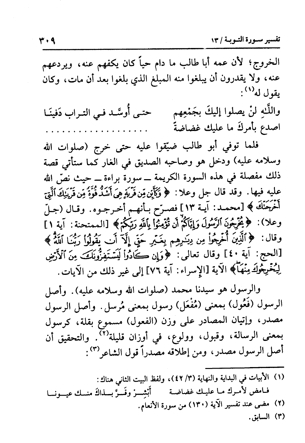فلما توفي أبو طالب ضيّقوا عليه حتى خرج (صلوات الله وسلامه عليه) ودخل هو وصاحبه الصديق في الغار كما ستأتي قصة ذلك مُفَصَّلة في هذه السورة الكريمة -سورة براءة- حيث نصّ الله عليه فيها. وقد قال جل وعلا: {وَكَأَيِّن مِّن قَرْيَةٍ هِيَ أَشَدُّ قُوَّةً مِّن قَرْيَتِكَ الَّتِي أَخْرَجَتْكَ} [محمد: آية 13] فصرَّح بأنهم أخْرَجُوه. وقال (جلّ وعلا): {يُخْرِجُونَ الرَّسُولَ وَإِيَّاكُمْ أَن تُؤْمِنُوا بِاللَّهِ رَبِّكُمْ} [الممتحنة: آية 1] وقال: {الَّذِينَ أُخْرِجُوا مِن دِيَارِهِمْ بِغَيْرِ حَقٍّ إِلاَّ أَن يَقُولُوا رَبُّنَا اللَّهُ} [الحج: آية 40] وقال تعالى: {وَإِن كَادُواْ لَيَسْتَفِزُّونَكَ مِنَ الأَرْضِ لِيُخْرِجوكَ مِنْهَا} [الإسراء: آية 76] إلى غير ذلك من الآيات.