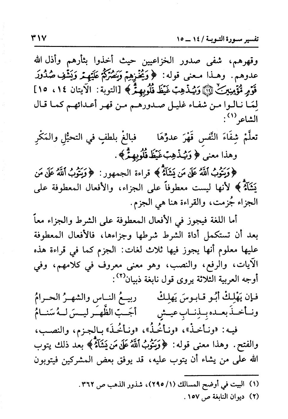 أما اللغة فيجوز في الأفعال المعطوفة على الشرط والجزاء معاً بعد أن تستكمل أداة الشرط شرطها وجزاءها، فالأفعال المعطوفة عليها معلوم أنها يجوز فيها ثلاث لغات: الجزم كما في قراءة هذه الآيات، والرفع، والنصب، وهو معنى معروف في كلامهم، وفي أوجه العربية الثلاثة يروى قول نابغة ذبيان (¬2):