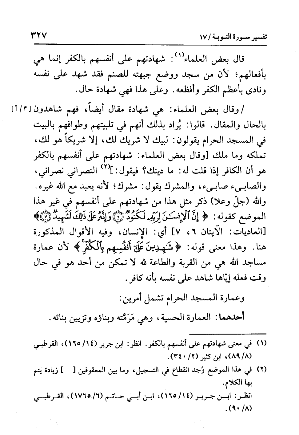 وقال بعضُ العلماءِ: هي شهادةُ مقالٍ أيضًا، فهم شاهدون بالحالِ والمقالِ. قالوا: يُرَادُ بذلك أنهم في تَلْبِيَتِهِمْ وطوافِهم بالبيتِ في المسجدِ الحرامِ يقولونَ: لَبَّيْكَ لا شريكَ لكَ، إلا شريكًا هو لَكَ، تملكُه وما مَلَكَ [وقال بعضُ العلماءِ: شهادتُهم على أنفسِهم بالكفرِ هو أن الكافرَ إذا قلتَ له: ما دِينُكَ؟ فيقول] (¬2) النصرانيُّ: نصرانيٌّ، والصابئ: صابئٌ، والمشركُ يقول: مشرك؛ لأنه يَعْبُدُ مع الله غيرَه. والله (جلَّ وعلا) ذَكَرَ مثلَ هذا من شهادتِهم على أنفسِهم في غيرِ هذا الموضعِ كقولِه: {إِنَّ الْإِنْسَانَ لِرَبِّهِ لَكَنُودٌ (6) وَإِنَّهُ عَلَى ذَلِكَ لَشَهِيدٌ (7)} [العاديات: الآيتان 6، 7] أي: الإنسان، وفيه الأقوالُ المذكورةُ هنا. وهذا معنَى قولِه: {شَاهِدِينَ عَلَى أَنفُسِهِمْ بِالْكُفْرِ} لأن عمارةَ مساجدِ اللَّهِ هي من القربةِ والطاعةِ لله لا تمكن من أحد هو في حال وقت فعله إيَّاها شاهدٌ على نفسه بأنه كافر.