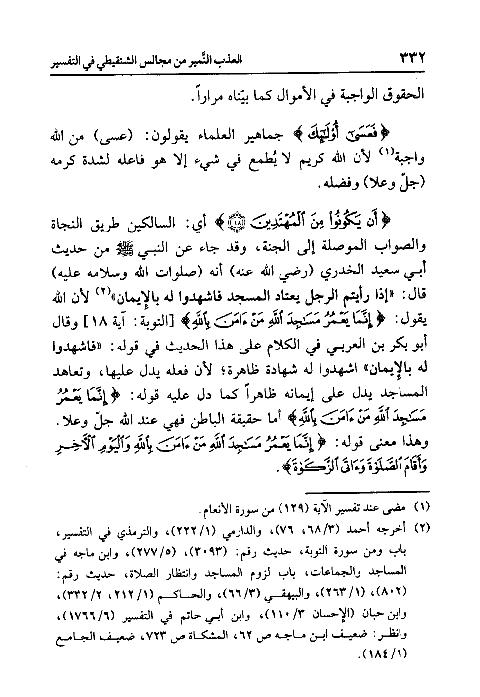 {أَنْ يَكُونُوا مِنَ الْمُهْتَدِينَ} أي: السالكينَ طريقَ النجاةِ والصوابِ الْمُوصِلَةَ إلى الجنةِ، وقد جاء عن النبيِّ صلى الله عليه وسلم من حديثِ أبي سعيد الخدري (رضي الله عنه) أنه (صلواتُ اللَّهِ وسلامُه عليه) قال: «إِذَا رَأَيْتُمُ الرَّجُلَ يَعْتَادُ الْمَسْجِدَ فَاشْهَدُوا لَهُ بِالإِيمَانِ» (¬2) لأن اللَّهَ يقولُ: {إِنَّمَا يَعْمُرُ مَسَاجِدَ اللَّهِ مَنْ آمَنَ بِاللَّهِ} [التوبة: آية 18] وقال أبو بكر بن العربي في الكلامِ على هذا الحديثِ في قولِه: «فَاشْهَدَوُا لَهُ بِالإِيمَانِ» اشْهَدُوا له شهادةً ظاهرةً؛ لأن فعلَه يدلُّ عليها، وتعاهد المساجد يدلُّ على إيمانِه ظاهرًا كما دَلَّ عليه قولُه: {إِنَّمَا يَعْمُرُ مَسَاجِدَ اللَّهِ مَنْ آمَنَ بِاللَّهِ} أما حقيقةُ الباطنِ فهي عندَ اللَّهِ جَلَّ وعلا. وهذا معنَى قولِه: {إِنَّمَا يَعْمُرُ مَسَاجِدَ اللَّهِ مَنْ آمَنَ بِاللَّهِ وَالْيَوْمِ الآخِرِ وَأَقَامَ الصَّلاةَ وَآتَى الزَّكَاةَ}.