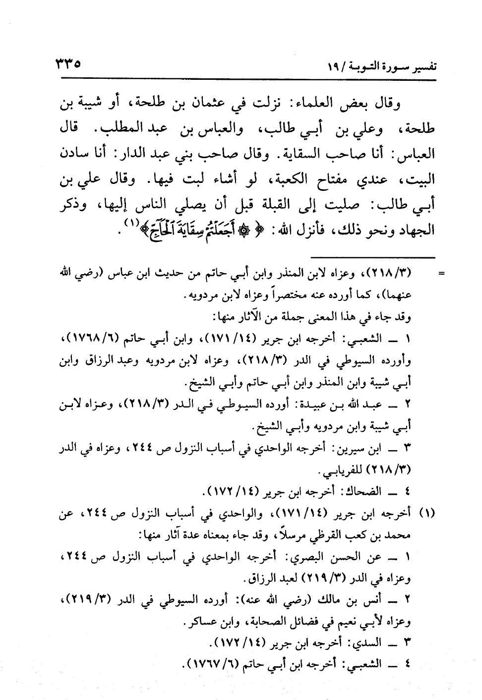وقال بعضُ العلماءِ: نزلت في عثمانَ بنِ طلحةَ، أو شيبةَ بنِ طلحةَ، وَعَلِيِّ بنِ أبي طالبٍ، والعباسِ بنِ عبدِ المطلبِ. قال العباسُ: أنا صاحبُ السقايةِ. وقال صاحبُ بَنِي عبدِ الدارِ: أنا سادنُ البيتِ، عندي مفتاحُ الكعبةِ، لو أشاءُ لَبِتُّ فيها. وقال عَلِيُّ بنُ أبِي طالبٍ: صليتُ إلى القبلةِ قبلَ أن يصليَ الناسُ إليها، وذكرَ الجهادَ ونحوَ ذلك، فأنزل اللَّهُ: {أَجَعَلْتُمْ سِقَايَةَ الْحَاجِّ} (¬1).