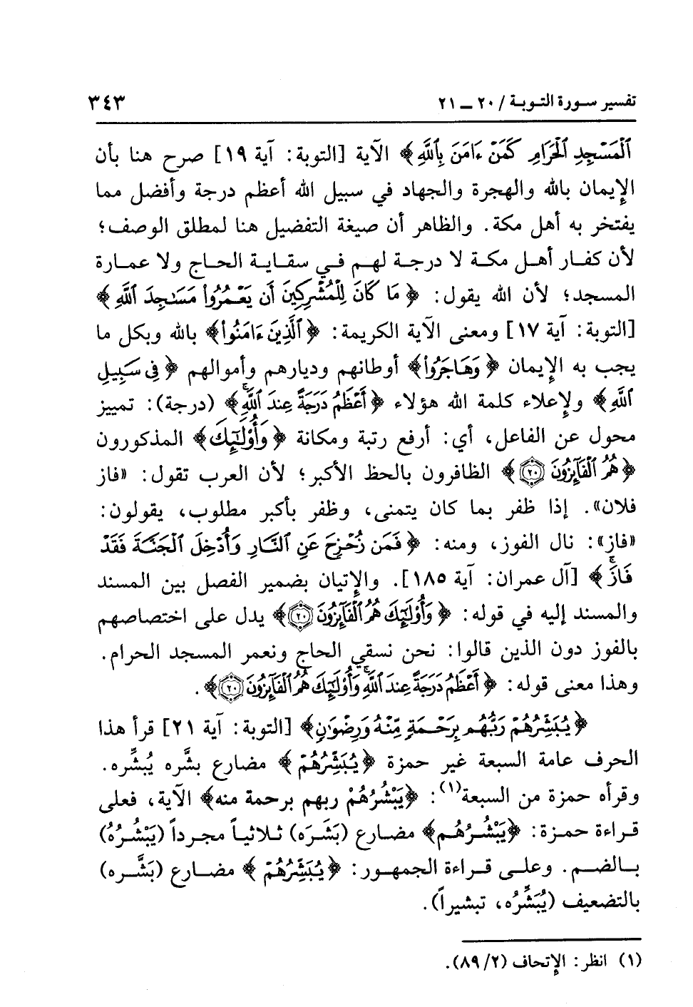 الْمَسْجِدِ الْحَرَامِ كَمَنْ آمَنَ بِاللَّهِ} الآية [التوبة: آية 19] صَرَّحَ هنا بأن الإيمانَ بِاللَّهِ والهجرةَ والجهادَ في سبيلِ اللَّهِ أعظمُ درجةً وأفضلُ مما يفتخرُ به أهلُ مكةَ. والظاهرُ أن صيغةَ التفضيلِ هنا لمطلقِ الوصفِ؛ لأن كفارَ أهلِ مكةَ لا درجةَ لهم في سقايةِ الحاجِّ ولا عمارةِ المسجدِ؛ لأن اللَّهَ يقولُ: {مَا كَانَ لِلْمُشْرِكِينَ أَنْ يَعْمُرُوا مَسَاجِدَ اللَّهِ} [التوبة: آية 17] ومعنَى الآيةِ الكريمةِ: {الَّذِينَ آمَنُوا} بالله وبكلِّ ما يجبُ به الإيمانُ {وَهَاجَرُوا} أوطانَهم وديارَهم وأموالَهم {فِي سَبِيلِ اللَّهِ} ولإعلاءِ كلمةِ اللَّهِ هؤلاء {أَعْظَمُ دَرَجَةً عِنْدَ اللَّهِ} (درجةً): تمييزٌ محولٌ عن الفاعلِ، أي: أَرْفَعُ رتبةً ومكانةً {وَأُولَئِكَ} المذكورونَ {هُمُ الْفَائِزُونَ} الظافرونَ بالحظِّ الأكبرِ؛ لأن العربَ تقولُ: «فاز فلان». إذا ظفر بما كان يتمنَّى، وظفر بأكبرِ مطلوبٍ، يقولونَ: «فاز»: نال الفوزَ، ومنه: {فَمَنْ زُحْزِحَ عَنِ النَّارِ وَأُدْخِلَ الْجَنَّةَ فَقَدْ فَازَ} [آل عمران: آية 185]. والإتيانُ بضميرِ الفصلِ بينَ المسندِ والمسندِ إليه في قولِه: {وَأُولَئِكَ هُمُ الْفَائِزُونَ} يدلُّ على اختصاصِهم بالفوزِ دونَ الذين قالوا: نحنُ نسقي الحاجَّ وَنُعَمِّرُ المسجدَ الحرامَ. وهذا معنَى قولِه: {أَعْظَمُ دَرَجَةً عِنْدَ اللَّهِ وَأُولَئِكَ هُمُ الْفَائِزُونَ}.