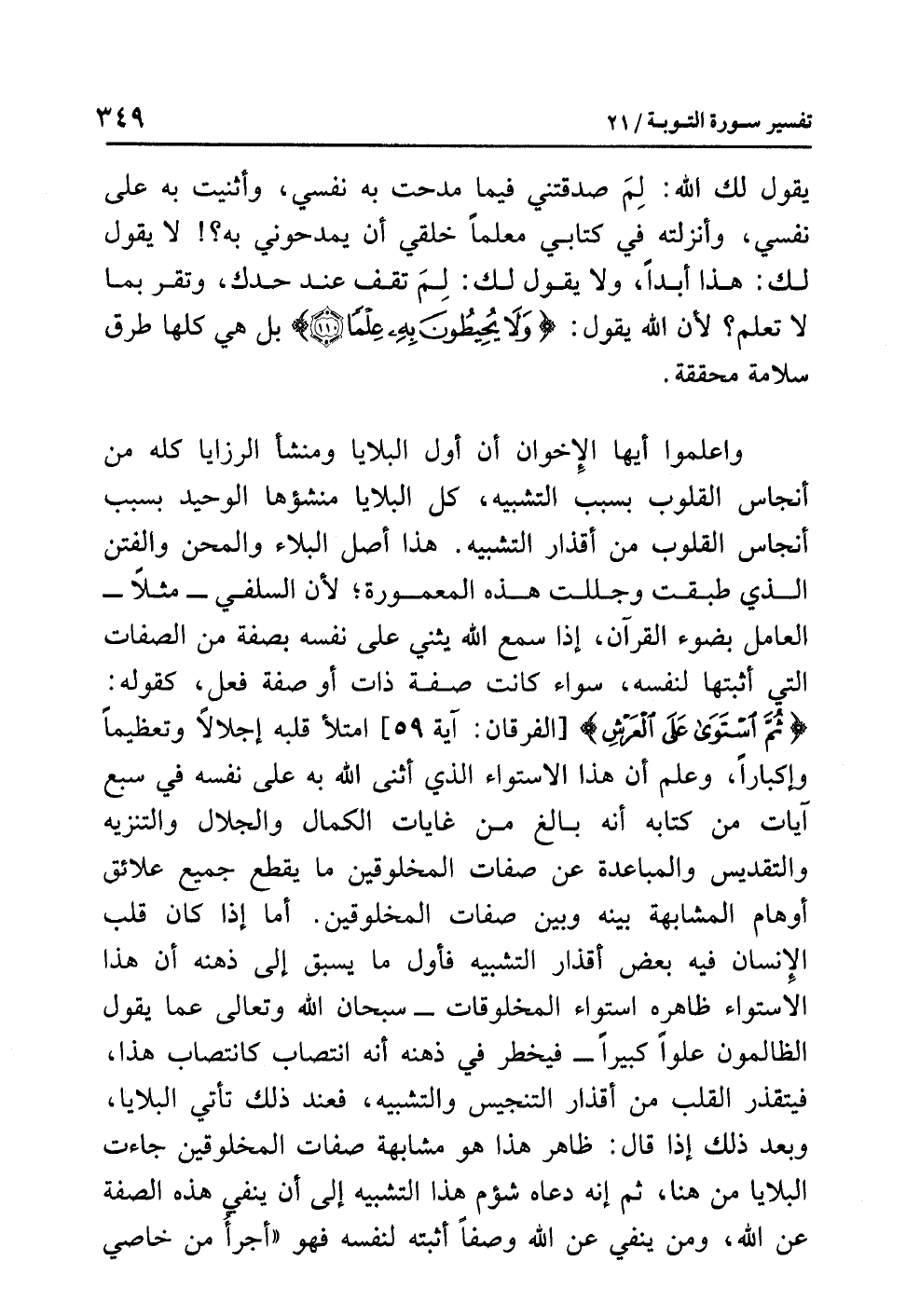 وَاعْلَمُوا أيها الإخوانُ أن أولَ البلايا ومنشأَ الرزايا كُلِّهَا من أنجاسِ القلوبِ بسببِ التشبيهِ، كُلُّ البلايا منشؤُها الوحيدُ بسببِ أنجاسِ القلوبِ من أقذارِ التشبيهِ. هذا أصلُ البلاءِ والمحنِ والفتنِ الذي طَبَّقَتْ وَجَلَّلَتْ هذه المعمورةَ؛ لأَنَّ السلفيَّ - مثلاً - العاملَ بضوءِ القرآنِ، إذا سَمِعَ اللَّهَ يُثنِي على نفسِه بصفةٍ من الصفاتِ التي أَثْبَتَهَا لنفسِه، سواء كَانَتْ صفةَ ذاتٍ أو صفةَ فِعْلٍ، كقولِه: {ثُمَّ اسْتَوَى عَلَى الْعَرْشِ} [الفرقان: آية 59] امتلأَ قَلْبُهُ إجلالاً وتعظيمًا وإكبارًا، وَعَلِمَ أن هذا الاستواءَ الذي أَثْنَى اللَّهُ به على نفسِه في سبعِ آياتٍ من كتابِه أنه بالغٌ من غاياتِ الكمالِ والجلالِ والتنزيهِ والتقديسِ والمباعدةِ عن صفاتِ المخلوقينَ ما يقطعُ جميعَ علائقِ أوهامِ المشابهةِ بينَه وبينَ صفاتِ المخلوقينَ. أما إذا كان قلبُ الإنسانِ فيه بعضُ أقذارِ التشبيهِ فأولُ ما يسبقُ إلى ذهنِه أن هذا الاستواءَ ظاهرُه استواءُ المخلوقاتِ - سبحانَ اللَّهِ وتعالى عَمَّا يقولُ الظالمونَ عُلُوًّا كبيرًا - فيخطرُ في ذهنِه أنه انتصابٌ كانتصابِ هذا، فَيَتَقَذَّرُ القلبُ من أقذارِ التنجيسِ والتشبيهِ، فعندَ ذلك تأتِي البلايا، وبعدَ ذلك إذا قال: ظاهرُ هذا هو مشابهةُ صفاتِ المخلوقينَ جاءت البلايا من هنا، ثم إنه دَعَاهُ شؤمُ هذا التشبيهِ إلى أن ينفيَ هذه الصفةَ عن اللَّهِ، وَمَنْ يَنْفِي عن اللَّهِ وَصْفًا أَثْبَتَهُ لنفسِه فهو «أَجْرَأُ من خَاصِي
