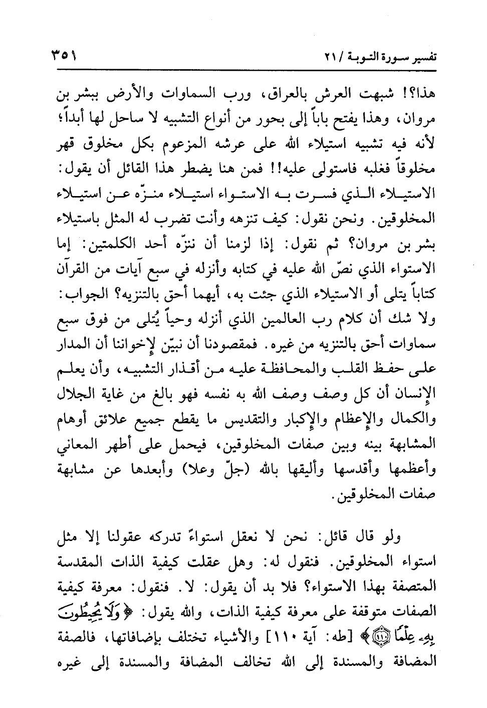 هذا؟! شَبَّهْتَ العرشَ بالعراقِ، وربَّ السماواتِ والأرضِ ببشرِ بنِ مروانَ، وهذا يفتحُ بابًا إلى بحورٍ من أنواعِ التشبيهِ لاَ ساحلَ لها أبدًا؛ لأنه فيه تشبيهُ استيلاءِ اللَّهِ على عرشِه المزعومِ بكلِّ مخلوقٍ قَهَرَ مخلوقًا فَغَلَبَهُ فَاسْتَوْلَى عليه!! فَمِنْ هنا يُضْطَرُّ هذا القائلُ أن يقولَ: الاستيلاءُ الذي فَسَّرْتَ به الاستواءَ استيلاءٌ مُنَزَّهٌ عن استيلاءِ المخلوقينَ. ونحن نقولُ: كيف تُنَزِّهُهُ وأنتَ تضربُ له المثلَ باستيلاءِ بشرِ بنِ مروانَ؟ ثم نقولُ: إذا لَزِمَنَا أن نُنَزِّهَ أحدَ الكلمتين: إما الاستواء الذي نَصَّ اللَّهُ عليه في كتابِه وَأَنْزَلَهُ في سبعِ آياتٍ من القرآنِ كتابًا يُتْلَى أو الاستيلاء الذي جئتَ به، أيهما أَحَقُّ بالتنزيهِ؟ والجوابُ: ولا شكَّ أن كلامَ ربِّ العالمينَ الذي أَنْزَلَهُ وَحْيًا يُتْلَى من فوقِ سبعِ سماواتٍ أحقُّ بالتنزيهِ من غيرِه. فمقصودُنا أن نُبَيِّنَ لإخوانِنا أن المدارَ على حفظِ القلبِ والمحافظةِ عليه من أقذارِ التشبيهِ، وأن يعلمَ الإنسانُ أن كُلَّ وصفٍ وَصَفَ اللَّهُ به نفسَه فهو بالغٌ من غايةِ الجلالِ والكمالِ والإعظامِ والإكبارِ والتقديسِ ما يقطعُ جميعَ علائقِ أوهامِ المشابهةِ بينَه وبينَ صفاتِ المخلوقينَ؛ فَيُحْمَلُ على أطهرِ المعانِي وأعظمِها وأقدسِها وأليقِها بِاللَّهِ (جلَّ وعلا) وأبعدِها عن مشابهةِ صفاتِ المخلوقينَ.