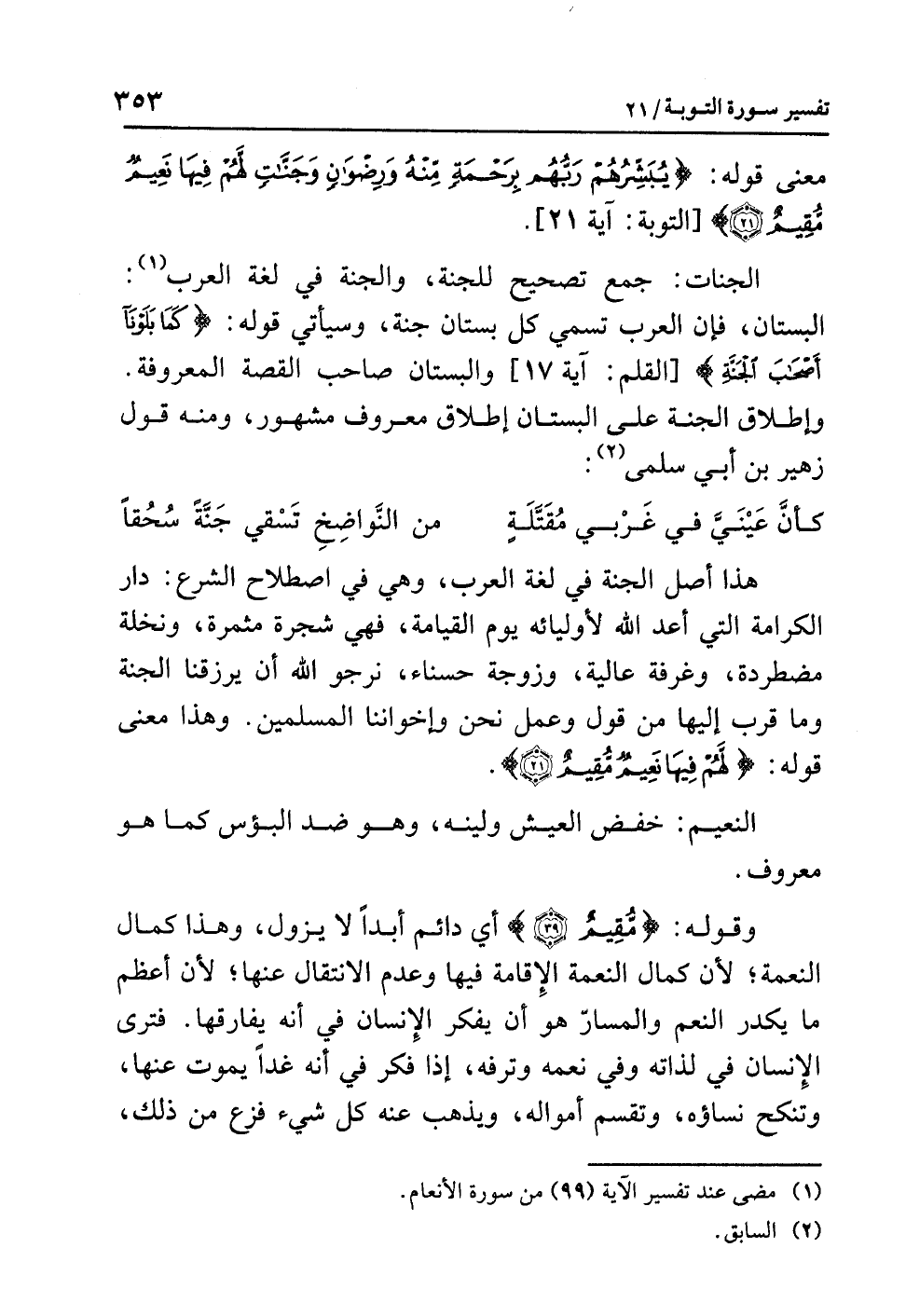 هذا أصلُ الجنةِ في لغةِ العربِ، وهي في اصطلاحِ الشرعِ: دارُ الكرامةِ التي أَعَدَّ اللَّهُ لأوليائِه يومَ القيامةِ، فهي شجرةٌ مثمرةٌ، ونخلةٌ مضطردةٌ، وغرفةٌ عاليةٌ، وزوجةٌ حسناءُ، نرجو اللَّهَ أن يرزقَنا الجنةَ وما قَرَّبَ إليها من قولٍ وعملٍ نحنُ وإخواننا المسلمينَ. وهذا معنَى قولِه: {لَّهُمْ فِيهَا نَعِيمٌ مُّقِيمٌ}.