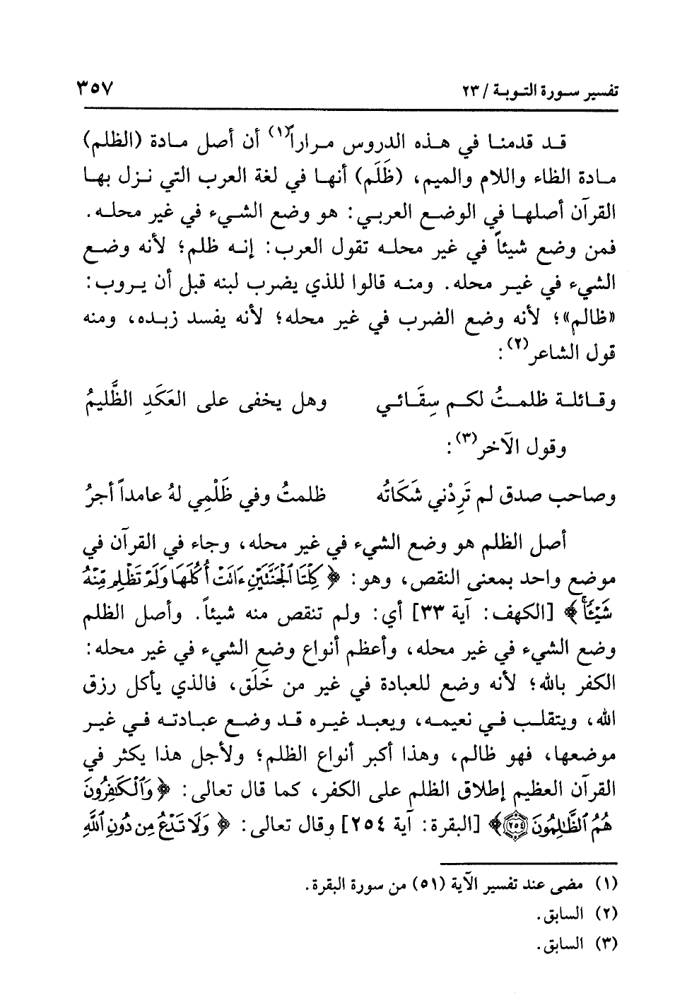 أصلُ الظلمِ هو وضعُ الشيءِ في غيرِ محلِّه، وجاءَ في القرآنِ في موضعٍ واحدٍ بمعنَى النقصِ، وهو: {كِلْتَا الْجَنَّتَيْنِ آتَتْ أُكُلَهَا وَلَمْ تَظْلِمْ مِنْهُ شَيْئًا} [الكهف: آية 33] أي: ولم تَنْقُصْ منه شيئًا. وأصلُ الظلمِ: وضعُ الشيءِ في غيرِ محلِّه، وأعظمُ أنواعِ وضعِ الشيءِ في غيرِ محلِّه: الكفرُ بالله؛ لأنه وَضْعٌ للعبادةِ في غيرِ مَنْ خَلَقَ، فالذي يأكلُ رزقَ اللَّهِ، ويتقلبُ في نعيمِه، ويعبدُ غيرَه قد وَضَعَ عبادتَه في غَيْرِ موضعِها؛ فهو ظالمٌ، وهذا أكبرُ أنواعِ الظلمِ؛ ولأجلِ هذا يكثرُ في القرآنِ العظيمِ إطلاقُ الظلمِ على الكفرِ، كما قال تعالى: {وَالْكَافِرُونَ هُمُ الظَّالِمُونَ} [البقرة: آية 254] وقال تعالى: {وَلاَ تَدْعُ مِنْ دُونِ اللَّهِ