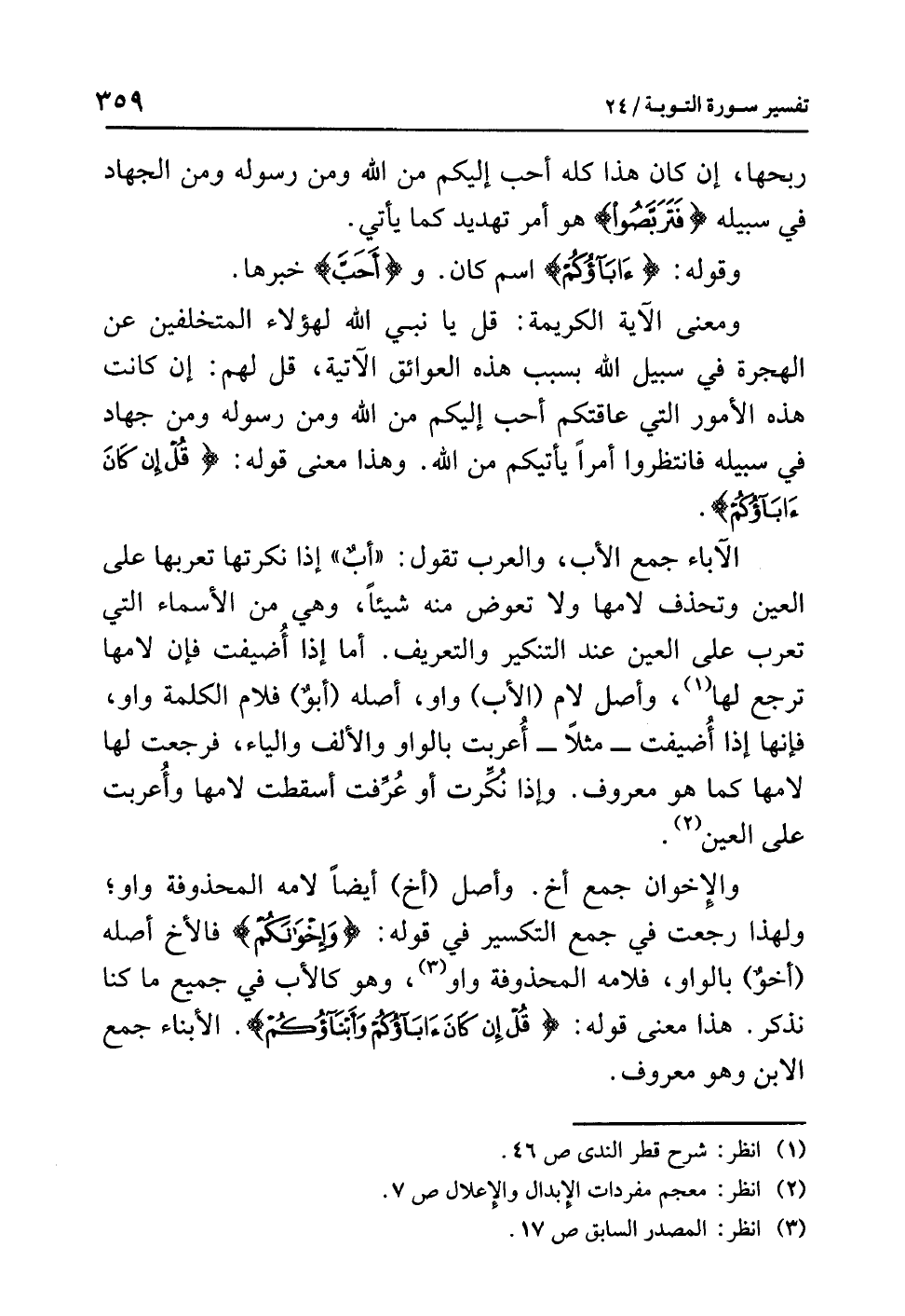 والإخوانُ جمعُ أخٍ. وأصلُ (أخٍ) أيضًا لاَمُهُ المحذوفةُ واو؛ ولهذا رَجَعَتْ في جمعِ التكسيرِ في قولِه: {وَإِخْوَانُكُمْ} فالأخُ أصلُه (أخوٌ) بالواوِ، فلامُه المحذوفةُ واوٌ (¬3)، وهو كالأبِ في جميعِ ما كنا نَذْكُرُ. هذا معنَى قولِه: {قُلْ إِنْ كَانَ آبَاؤُكُمْ وَأَبْنَاؤُكُمْ}. الأبناءُ جمعُ الابنِ وهو معروفٌ.