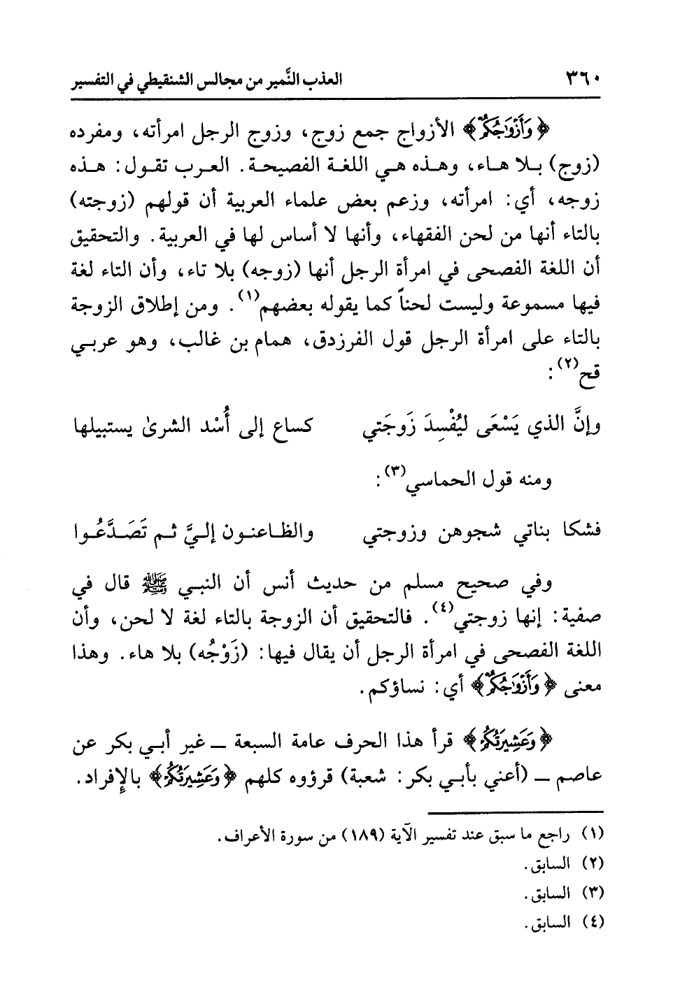 وفي صحيحِ مسلمٍ من حديثِ أَنَسٍ أن النبيَّ صلى الله عليه وسلم قال في صفيةَ: إنها زوجتِي (¬4). فالتحقيقُ أن الزوجةَ بالتاءِ لغةٌ لاَ لَحْن، وأن اللغةَ الفصحى في امرأةِ الرجلِ أن يقال فيها: (زَوْجُهُ) بلا هاءٍ. وهذا معنَى {وَأَزْوَاجُكُمْ} أي: نِسَاؤُكُمْ.