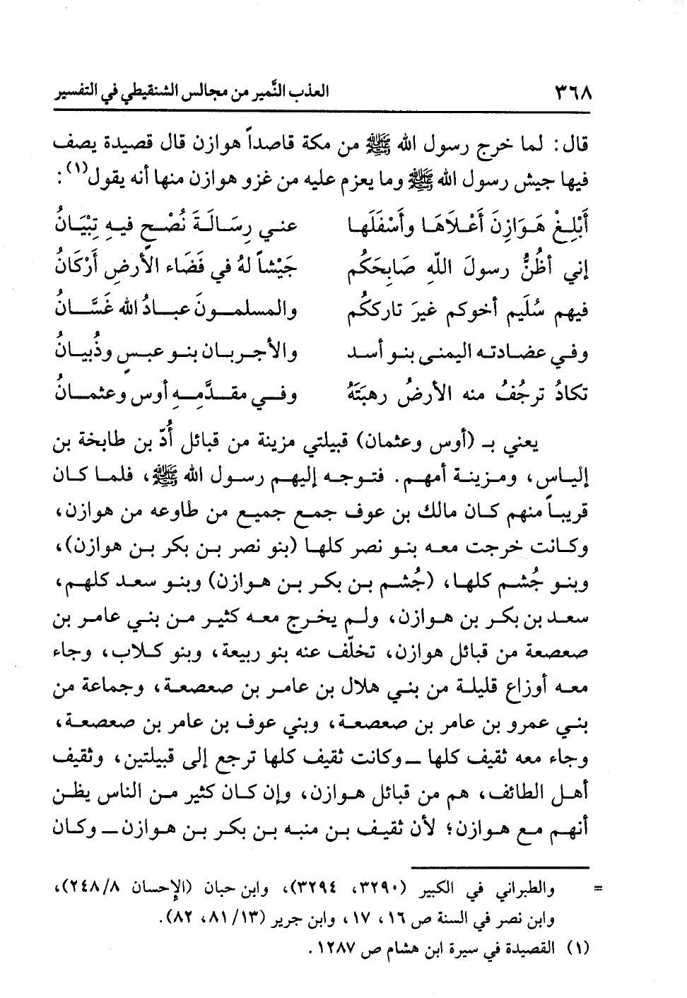يعني بـ (أوسٌ وعثمانُ) قَبِيلَتَيْ مُزَيْنَةَ من قبائلِ أُدِّ بنِ طابخةَ بنِ إلياس، ومزينةُ أُمُّهُمْ. فَتَوَجَّهَ إليهم رسولُ الله صلى الله عليه وسلم، فَلَمَّا كان قَرِيبًا منهم كان مالكُ بنُ عوفٍ جَمَعَ جميعَ مَنْ طَاوَعَهُ مِنْ هَوَازِنَ، وكانت خَرَجَتْ معه بنو نصرٍ كُلُّهَا (بَنُو نصرِ بنِ بكرِ بنِ هوازنَ)، وبنو جُشَمَ كُلُّهَا، (جُشَمُ بنُ بكرِ بنِ هوازنَ) وبنو سعدٍ كُلُّهُمْ، (سعدُ بنُ بكرِ بنِ هوازنَ)، ولم يخرج معه كثيرٌ من بَنِي عامرِ بنِ صعصعةَ من قبائلِ هوازنَ، تَخَلَّفَ عنه بَنُو ربيعةَ، وبنو كلابٍ، وجاء معه أوزاعٌ قليلةٌ من بَنِي هلالِ بنِ عامرِ بنِ صعصعةَ، وجماعةٌ من بني عمرِو بنِ عامرِ بنِ صعصعةَ، وَبَنِي عوفِ بنِ عامرِ بنِ صعصعةَ، وجاء معه ثقيفٌ كُلُّهَا، وكانت ثقيفٌ كُلُّهَا ترجع إلى قبيلتين، وثقيف أهل الطائف، وثقيف هو ابنُ بكرِ بنِ مُنَبِّهِ بنِ هوازنَ، هم من قبائلِ هوازنَ، وإن كان كثيرٌ من الناس يَظُنُّ أنهم مع هوازنَ، فَهُمْ من هوازنَ؛ لأن ثقيفَ بنَ مُنَبِّهِ بنِ بكرِ بنِ هوازنَ جاءت معه ثقيف كلها لم يَبْقَ منهم أَحَدٌ، وكان