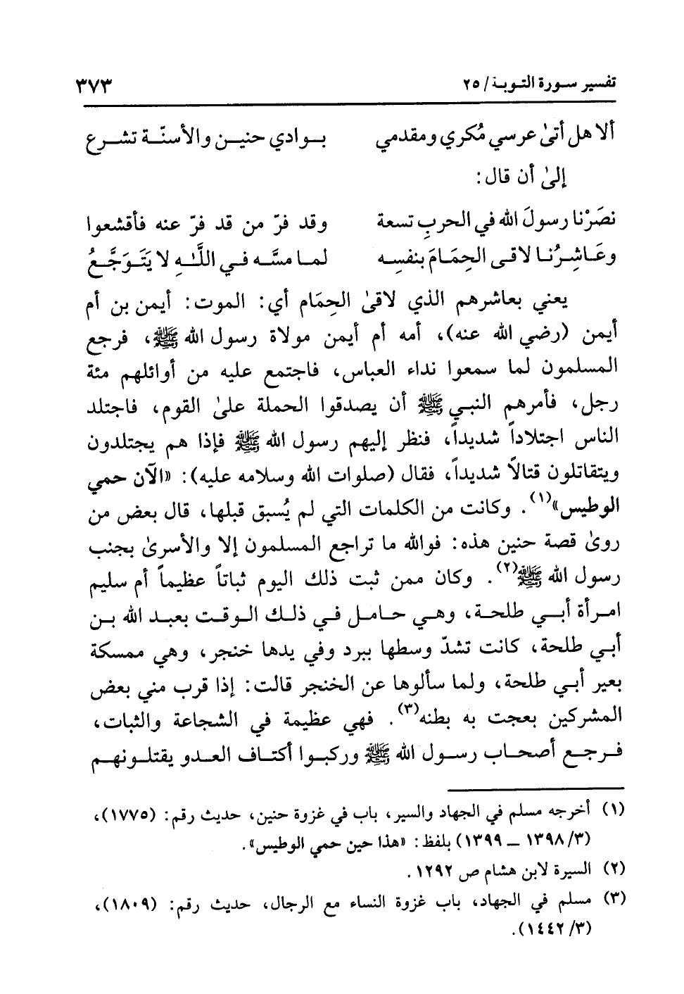 يعنِي بعاشرِهم الذي لاَقَى الحِمَامَ أي: الموتَ: أيمنَ بنَ أُمِّ أيمنَ (رضي الله عنه)، أُمُّهُ أُمُّ أيمنَ مولاةُ رسولِ اللَّهِ صلى الله عليه وسلم، فرجع المسلمونَ لَمَّا سَمِعُوا نداءَ العباسِ، فاجتمعَ عليه من أوائلهم مئةُ رجلٍ، فَأَمَرَهُمُ النبيُّ صلى الله عليه وسلم أن يَصْدُقُوا الحملةَ على القومِ، فَاجْتَلَدَ الناسُ اجْتِلاَدًا شديدًا، فَنَظَرَ إليهم رسولُ الله صلى الله عليه وسلم فإذا هم يَجْتَلِدُونَ ويتقاتلونَ قتالاً شديدًا، فقال (صلواتُ اللَّهِ وسلامُه عليه): «الآنَ حَمِيَ الْوَطِيسُ» (¬1). وكانت من الكلماتِ التي لم يُسْبَقْ قَبْلَهَا، قال بعضُ مَنْ رَوَى قِصَّةَ حنينٍ هذه: فوالله ما تَرَاجَعَ المسلمونَ إِلاَّ وَالأَسْرَى بجنبِ رسولِ اللَّهِ صلى الله عليه وسلم (¬2). وكان مِمَّنْ ثَبَتَ ذلك اليومَ ثَبَاتًا عظيمًا أُمُّ سليمٍ امرأةُ أَبِي طلحةَ، وهي حَامِلٌ في ذلك الوقتِ بعبدِ اللَّهِ بنِ أَبِي طَلْحَةَ، كانت تشدُّ وَسْطَهَا بِبُرْدٍ وفي يدِها خنجرٌ، وهي مُمْسِكَةٌ بعيرِ أَبِي طلحةَ، وَلَمَّا سَأَلُوهَا عن الخنجرِ قالت: إذا قَرُبَ مِنِّي بعضُ المشركين بَعَجْتُ به بَطْنَهُ (¬3). فهي عظيمةٌ في الشجاعةِ والثباتِ، فرجعَ أصحابُ رسولِ اللَّهِ صلى اللَّهُ عليه وسلم وَرَكِبُوا أكتافَ العدوِّ يَقْتَلُونَهُمْ