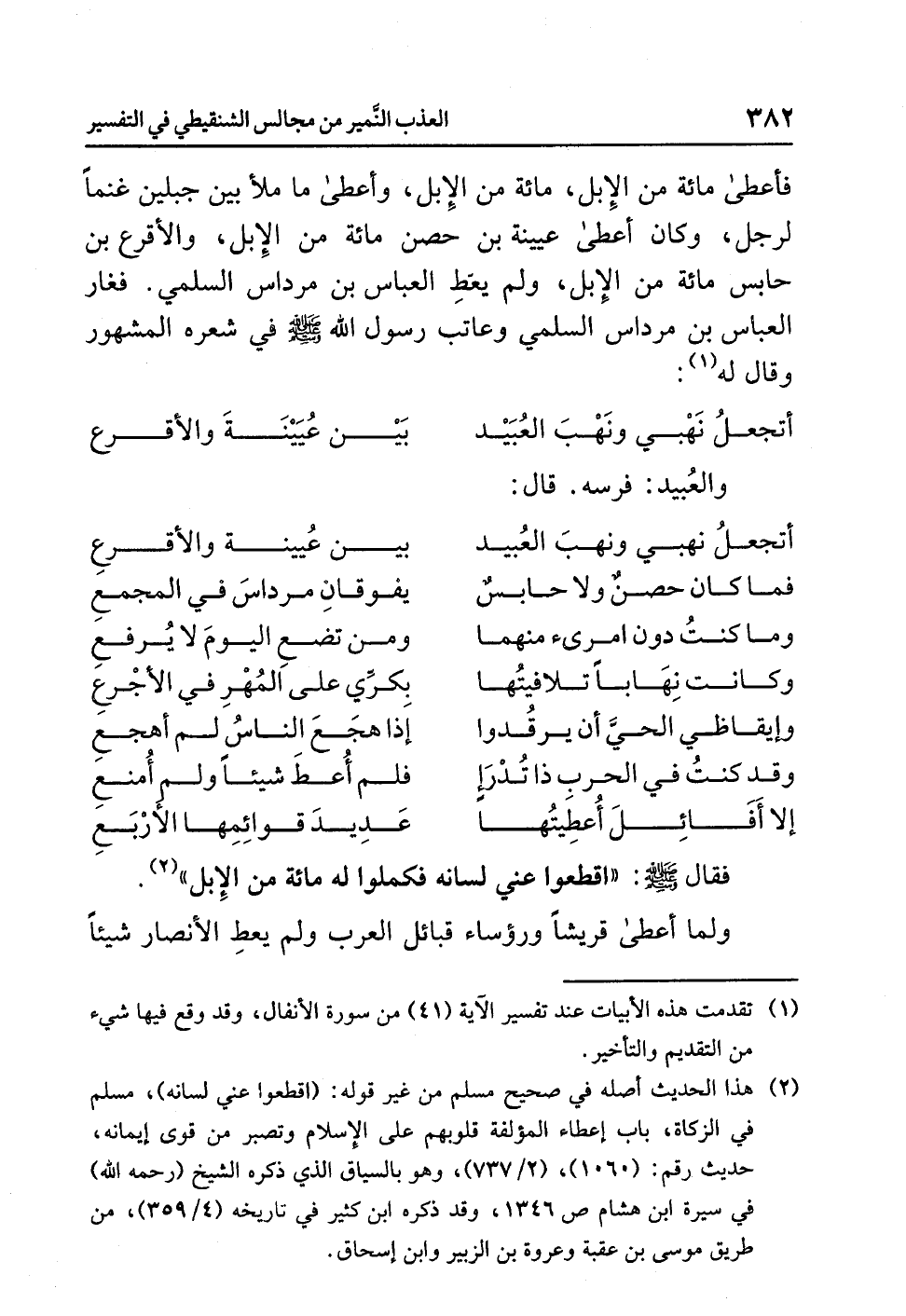 فأعطى مائةً من الإبلِ، مائةً من الإبلِ، وأعطى ما مَلأَ بين جَبَلَيْنِ غَنَمًا لرجلٍ، وكان أعطى عيينةَ بنَ حصنٍ مائةً من الإبلِ، والأقرعَ بنَ حابسٍ مائةً من الإبلِ، ولم يُعْطِ العباسَ بنَ مرداسٍ السلميَّ. فغار العباسُ بنُ مرداسٍ السلميُّ وَعَاتَبَ رسولَ اللَّهِ صلى الله عليه وسلم في شِعْرِهِ المشهورِ وقال له (¬1):