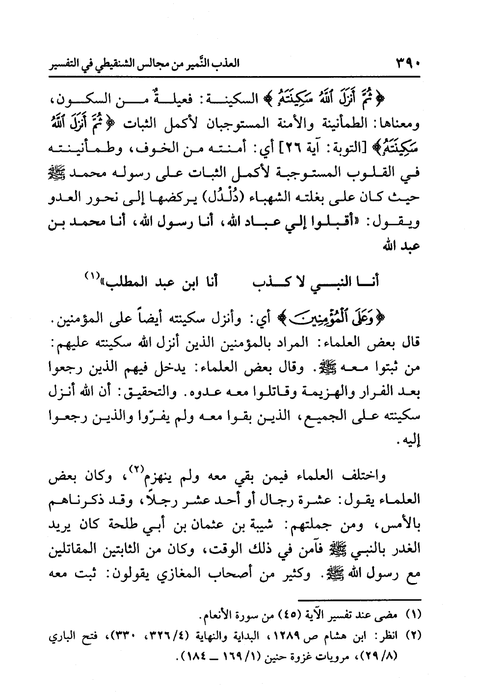 {ثُمَّ أَنْزَلَ اللَّهُ سَكِينَتَهُ} السكينةُ: فعيلةٌ من السكونِ، ومعناها: الطمأنينةُ والأَمَنَةُ المستوجبانِ لأكملِ الثباتِ {ثُمَّ أَنْزَلَ اللَّهُ سَكِينَتَهُ} [التوبة: آية 26] أي: أَمَنَتَهُ من الخوفِ، وطمأنينتَه في القلوبِ المستوجبةِ لأكملِ الثباتِ على رسولِه محمد صلى الله عليه وسلم حيث كان على بغلتِه الشهباءِ (دُلْدُل) يركضُها إلى نحورِ العدوِّ ويقولُ: «أَقْبِلُوا إِلَيَّ عِبَادَ اللَّهِ، أَنَا رَسُولُ اللَّهِ، أَنَا مُحَمَّدُ بْنُ عَبْدِ اللَّهِ