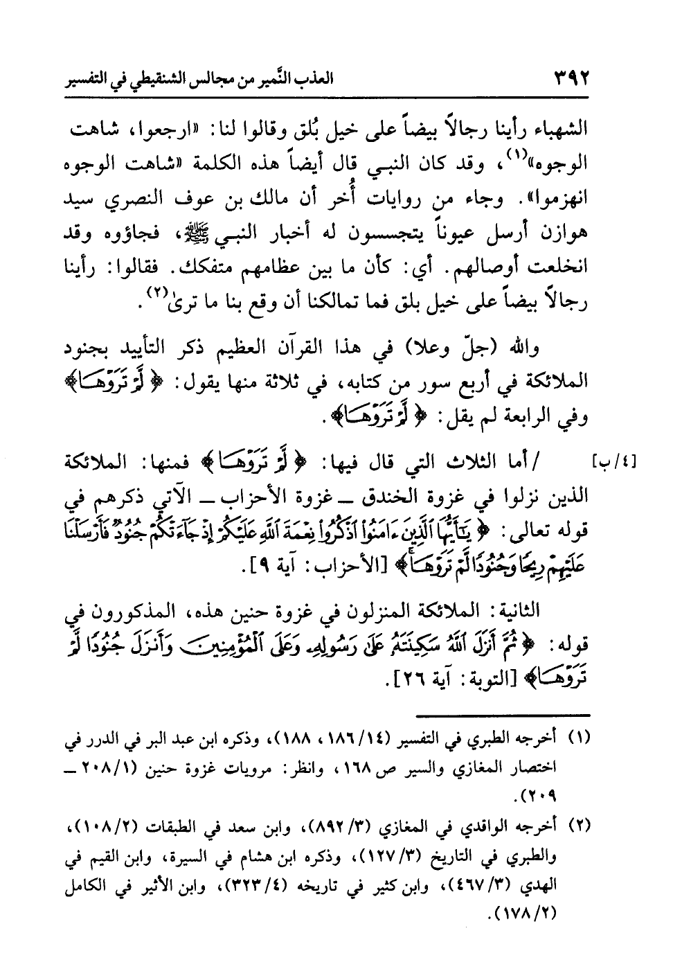 الثانيةُ: الملائكةُ الْمُنَزَّلُونَ في غزوةِ حنينٍ هذه، المذكورونَ في قولِه: {ثُمَّ أَنْزَلَ اللَّهُ سَكِينَتَهُ عَلَى رَسُولِهِ وَعَلَى الْمُؤْمِنِينَ وَأَنْزَلَ جُنُودًا لَّمْ تَرَوْهَا} [التوبة: آية 26].